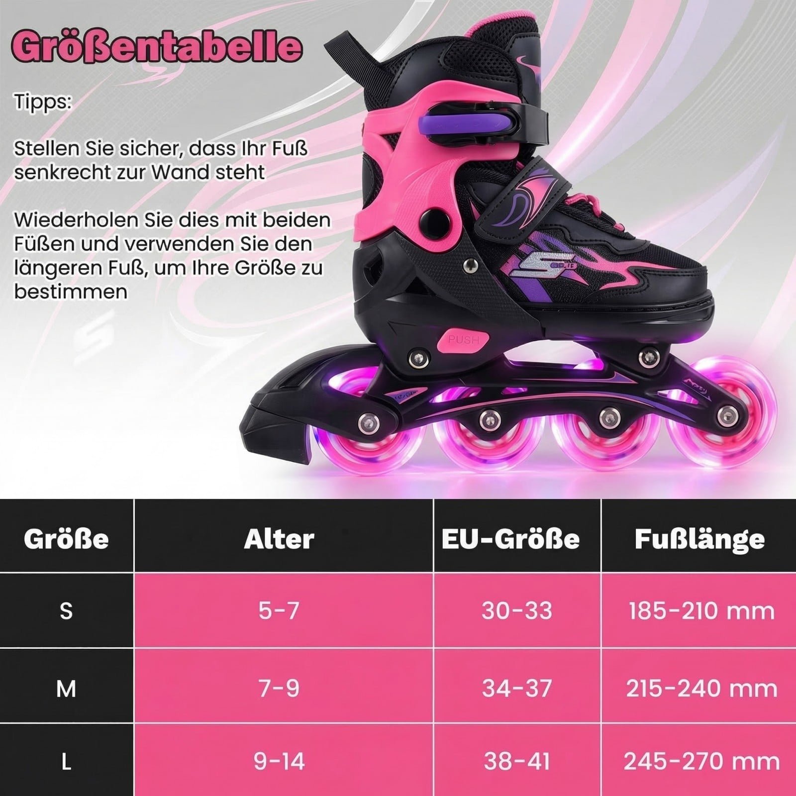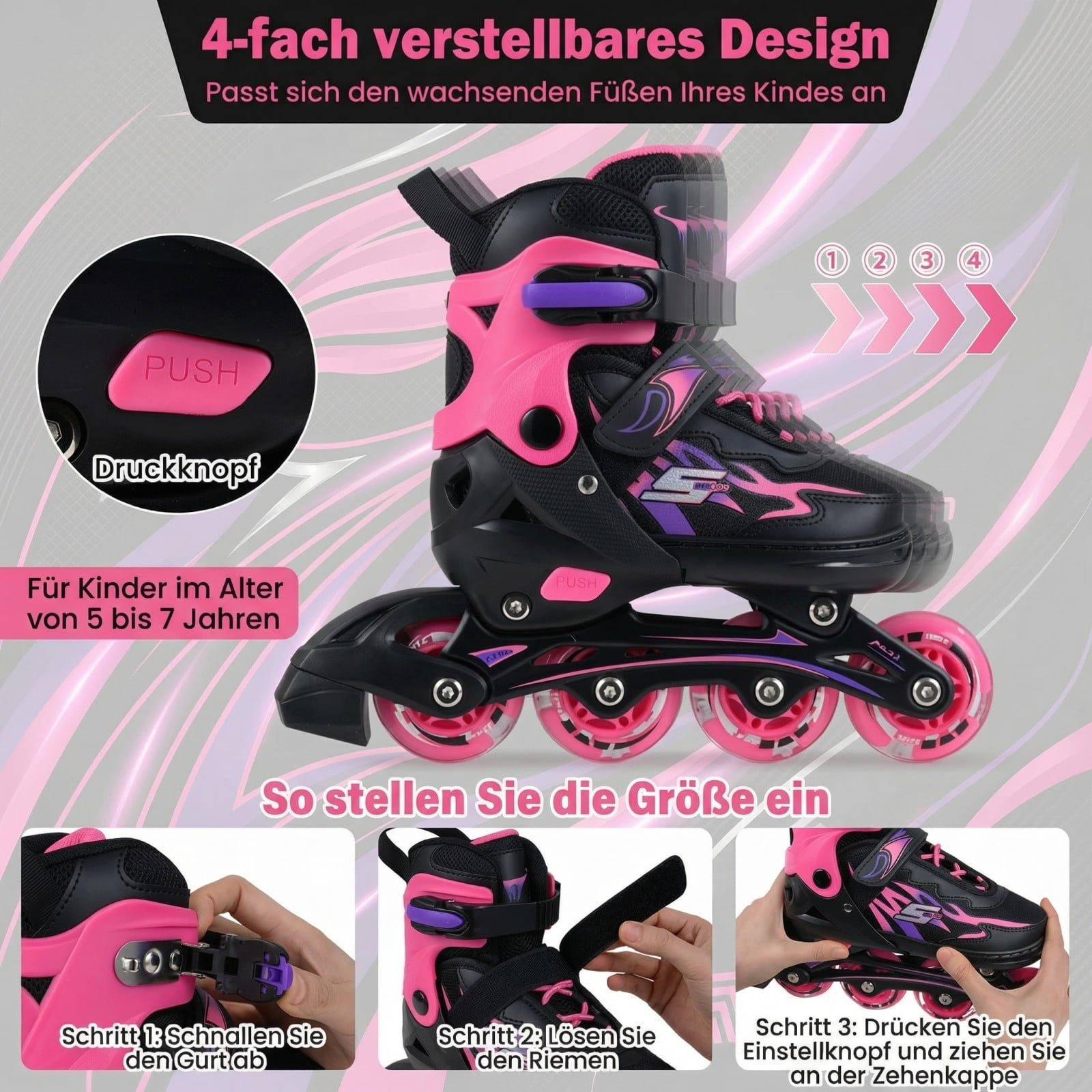 - 4 padėčių dydžio reguliavimas: Lengvai prisitaiko prie augančios pėdos, užtikrinant ilgaamžiškumą ir patogumą.