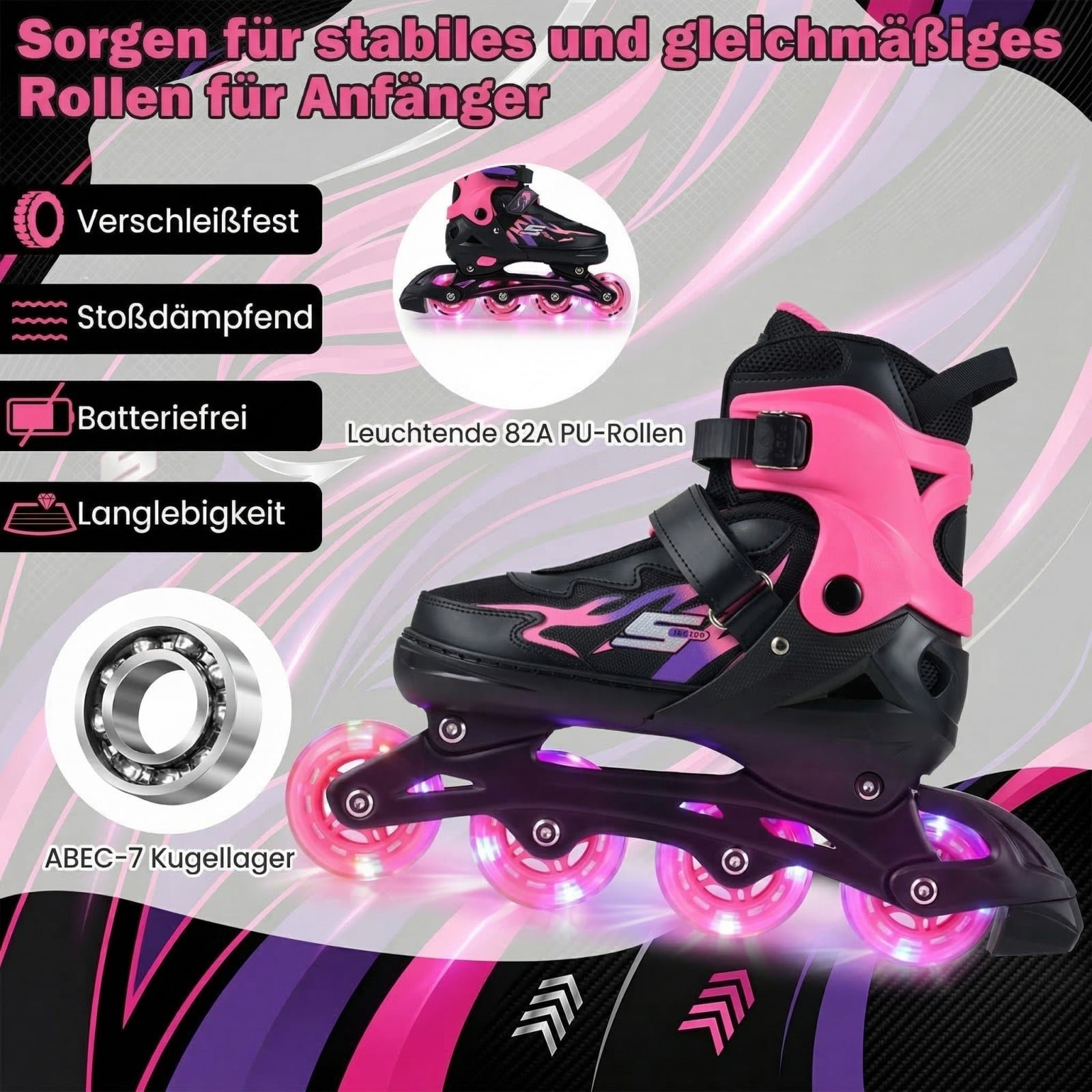 - Patogus ir sklandus važiavimas: Kvėpuojantis audinys ir ABEC-7 guoliai garantuoja komfortą ir stabilumą.