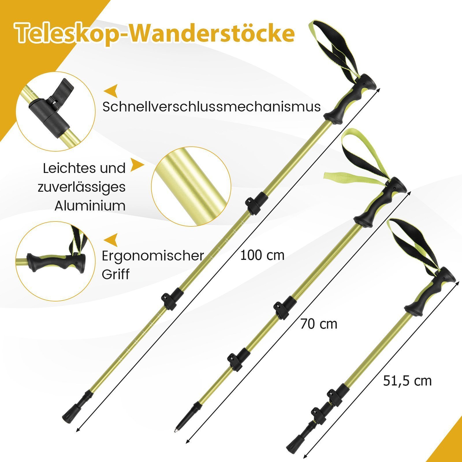 - Reguliuojamos teleskopinės lazdos su ergonomiškomis rankenomis ir įvairiais antgaliais.