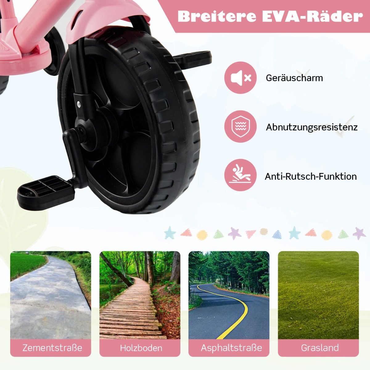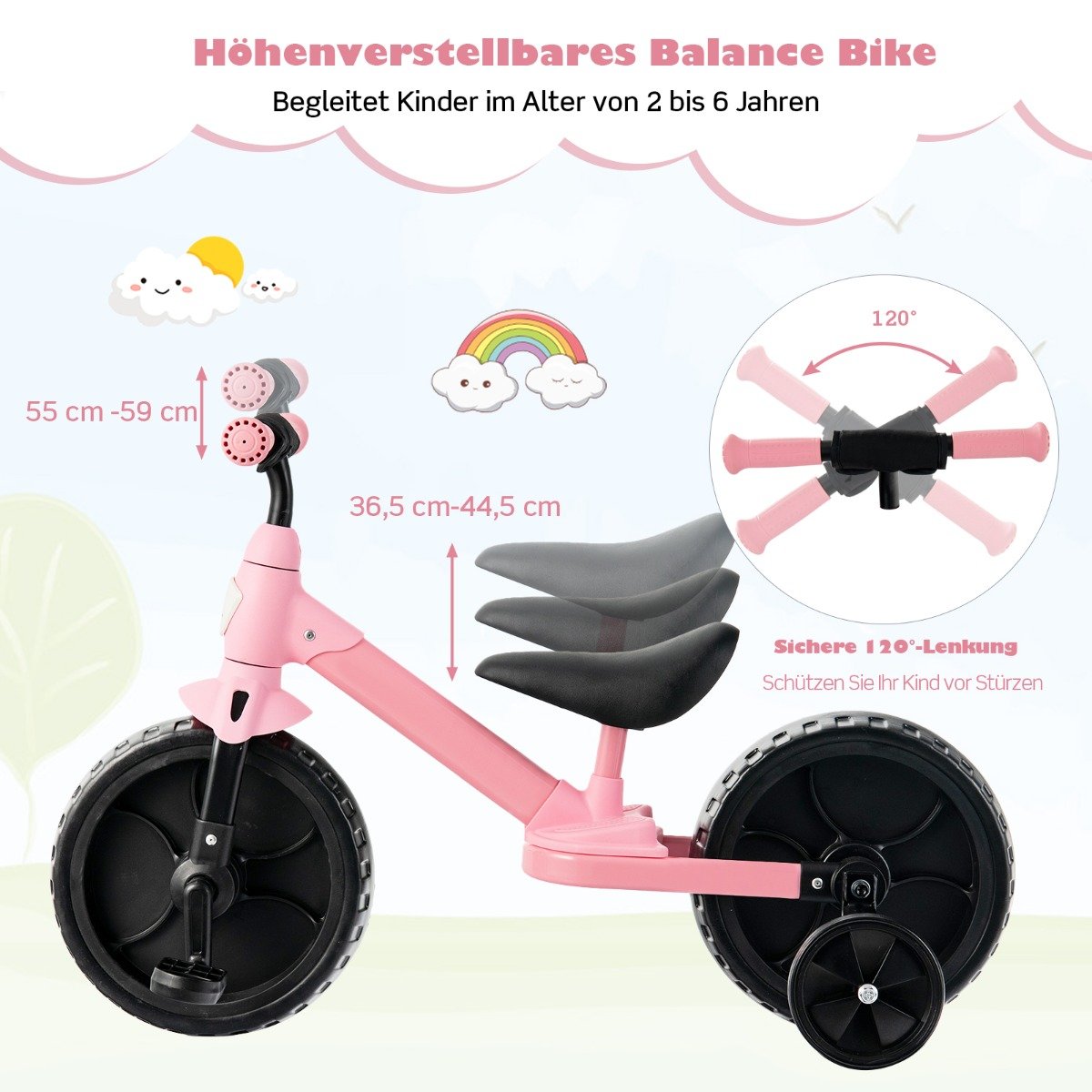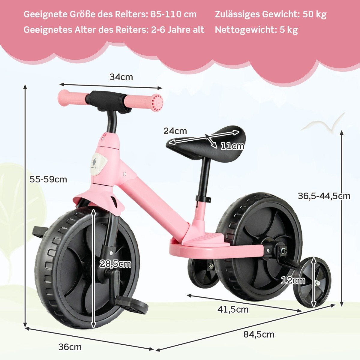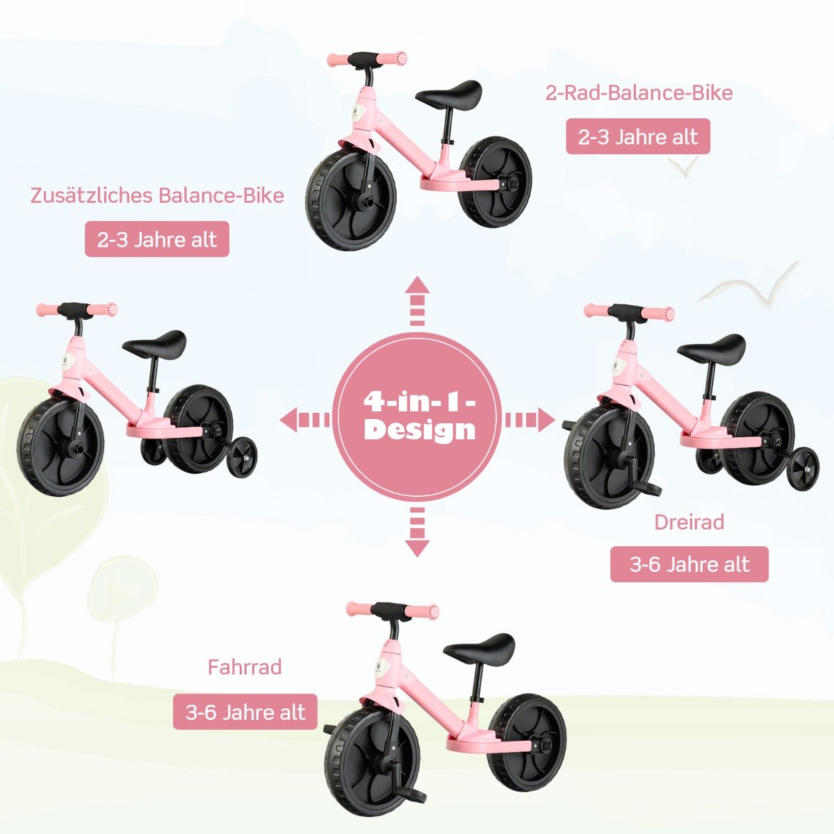 Vaikų dviratukas 4in1 su reguliuojamu vairu ir atraminiais ratais (Rožinė)