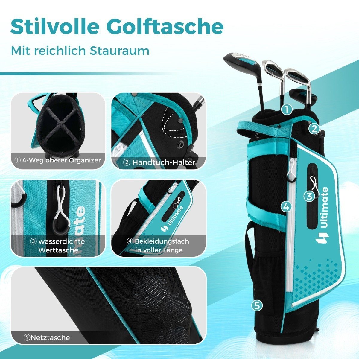 Supažindinkite savo vaikus su golfo žaidimo džiaugsmu naudodamiesi šiuo išsamiu jaunimo golfo lazdų komplektu, sukurtu vaikams nuo 5 iki 7 metų. Komplekte yra golfo krepšys su stovu ir pakankamai vietos visoms svarbiausioms golfo reikmenims. Apsauginis gaubtas nuo lietaus leis jūsų vaikui žaisti net ir per lietų.