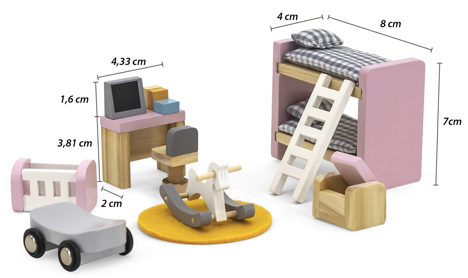 - Dviaukštė lova: 8 x 4 x 7 cm.