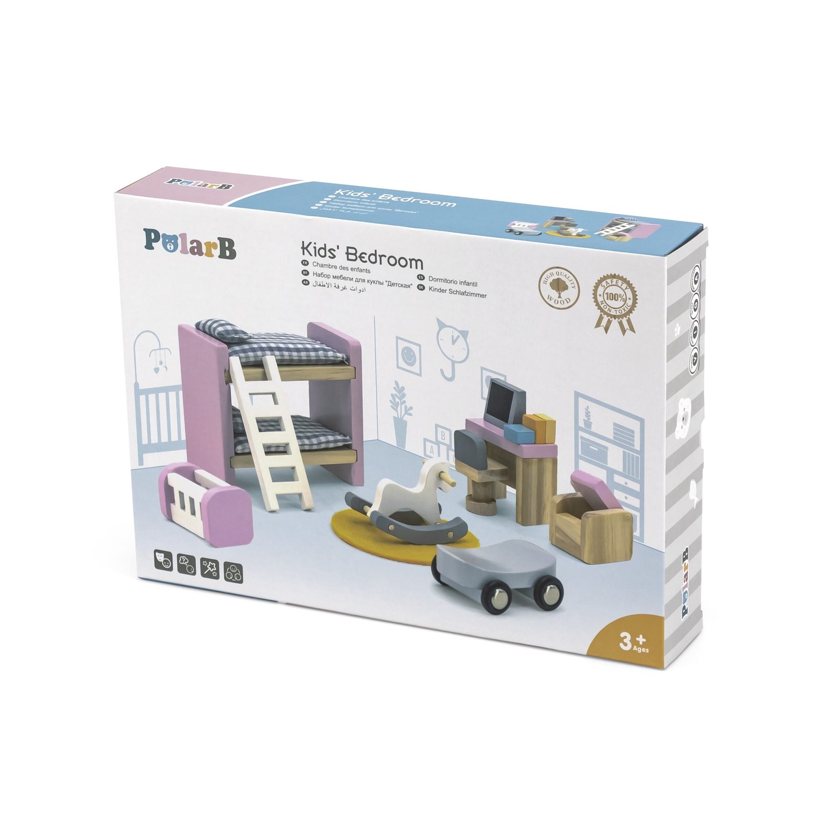 - Rinkinį sudaro: rašomasis stalas su kompiuteriu, kėdutė, lopšys, dviaukštė lova su kopėtėlėmis, kilimėlis, paspiriamas žaislas, supamasis arkliukas ir pufas.