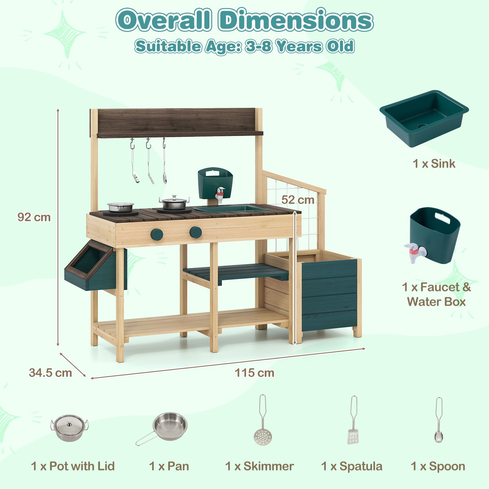 Ši medinė virtuvėlė su viryklės kaitvietėmis ir pasukamais mygtukais suteikia tikrovišką žaidimo patirtį, skatinančią vaikų vaizduotę ir kulinarinius įgūdžius. Nuimama kriauklė, maišytuvas ir vandens bakelis užtikrina daugybę linksmybių žaidžiant lauke. Integruota daigyklė su grotelėmis moko vaikus rūpintis augalais ir puoselėja meilę gamtai nuo mažens.