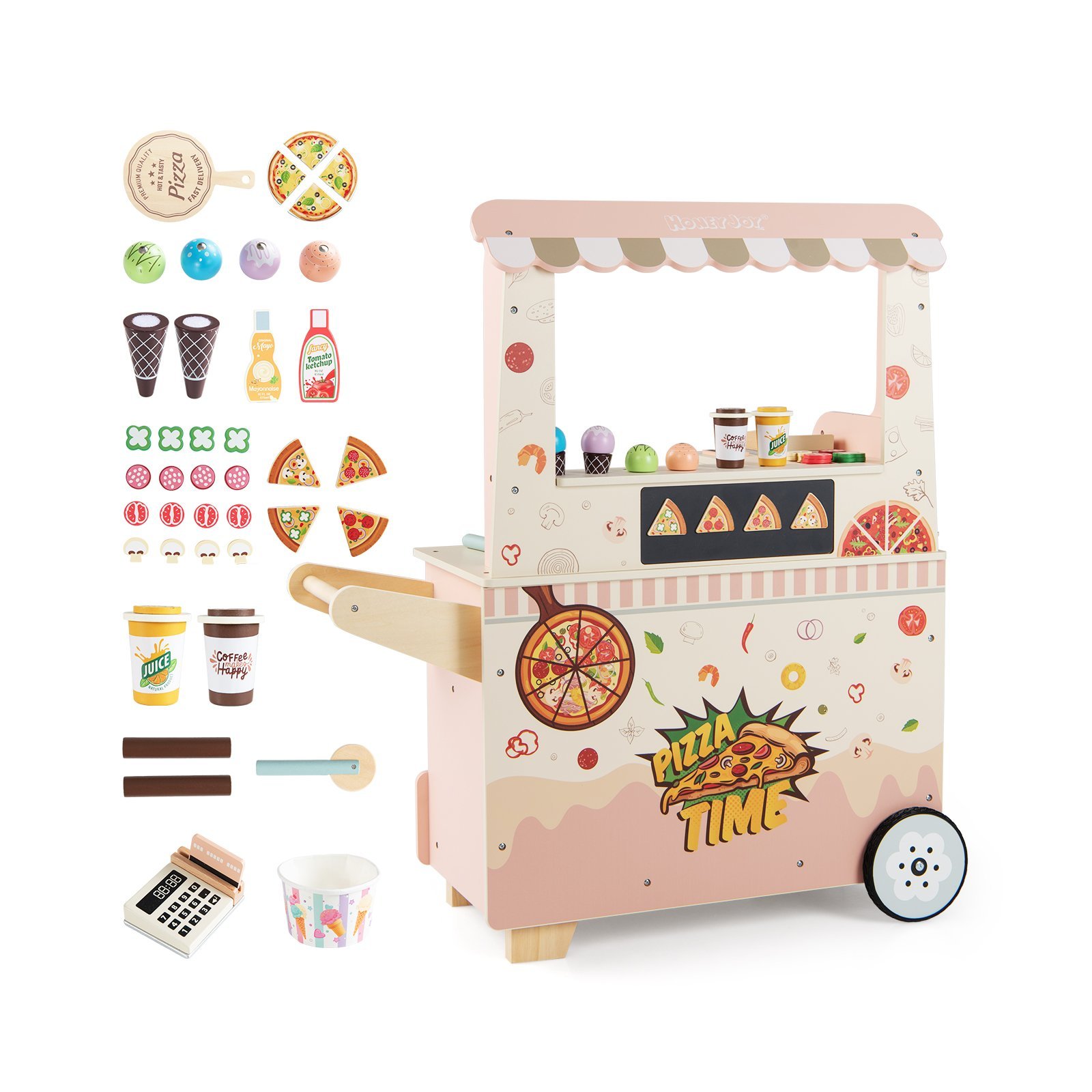 Vaikų medinis žaidimų maisto vagonėlis su picos krosnele (Rožinė)