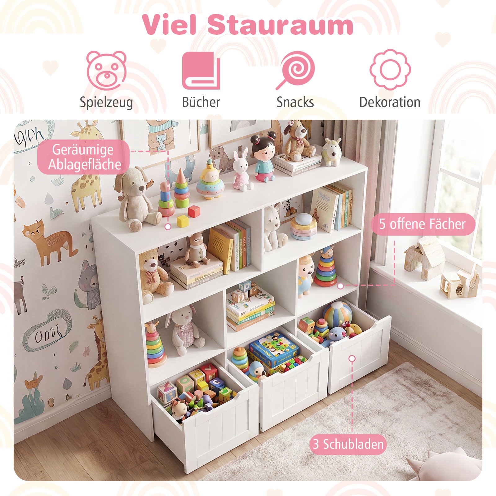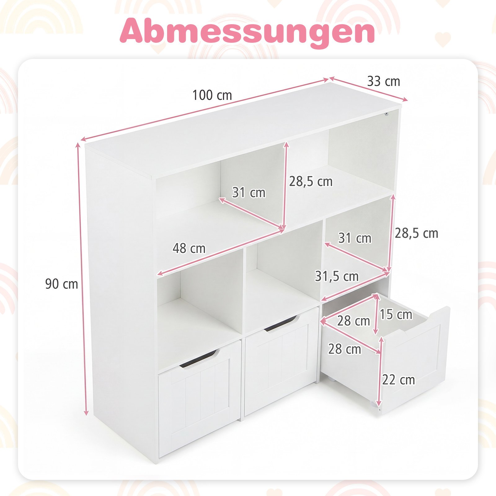 Ši specialiai vaikams sukurta spintelė siūlo daug vietos daiktams ir patrauklią estetiką, kuri suteiks žaismingumo bet kuriam vaikų, žaidimų ar kūdikių kambariui. Pagaminta iš aukštos kokybės MDF, ji yra tvirta ir stabili, garantuojanti ilgą tarnavimo laiką. Penki atviri skyriai ir trys erdvūs stalčiai su ratukais leidžia vaikams lengvai susidėti ir eksponuoti žaislus, drabužius, knygas ir daug daugiau. Tai padeda paversti netvarkingą kambarį tvarkinga ir organizuota erdve. Spintelė yra puiki dovana vaikams, ugdanti tvarkingumo įpročius.