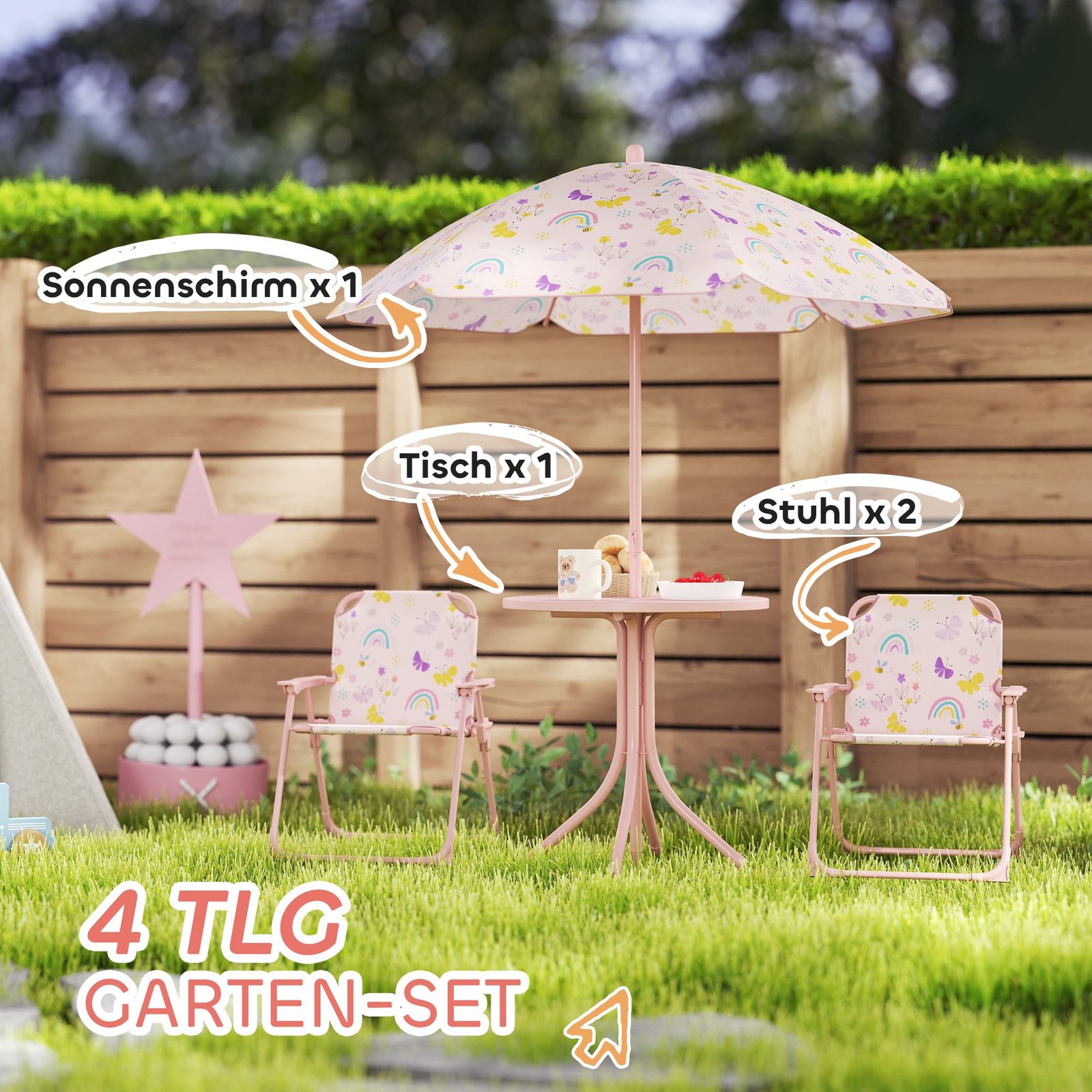 Paverskite savo sodą stebuklinga žaidimų vieta su šiuo vaikišku sėdimuoju komplektu, papuoštu žaviu vaivorykštės dizainu. Rinkinį sudaro dvi sulankstomos kėdės ir stalas su anga centre reguliuojamam skėčiui nuo saulės, idealiai tinkančiam apsaugai saulėtomis dienomis. Puikiai tinka vaikams nuo 2 iki 5 metų, komplektą galima lengvai sulankstyti ir laikyti taupant vietą.