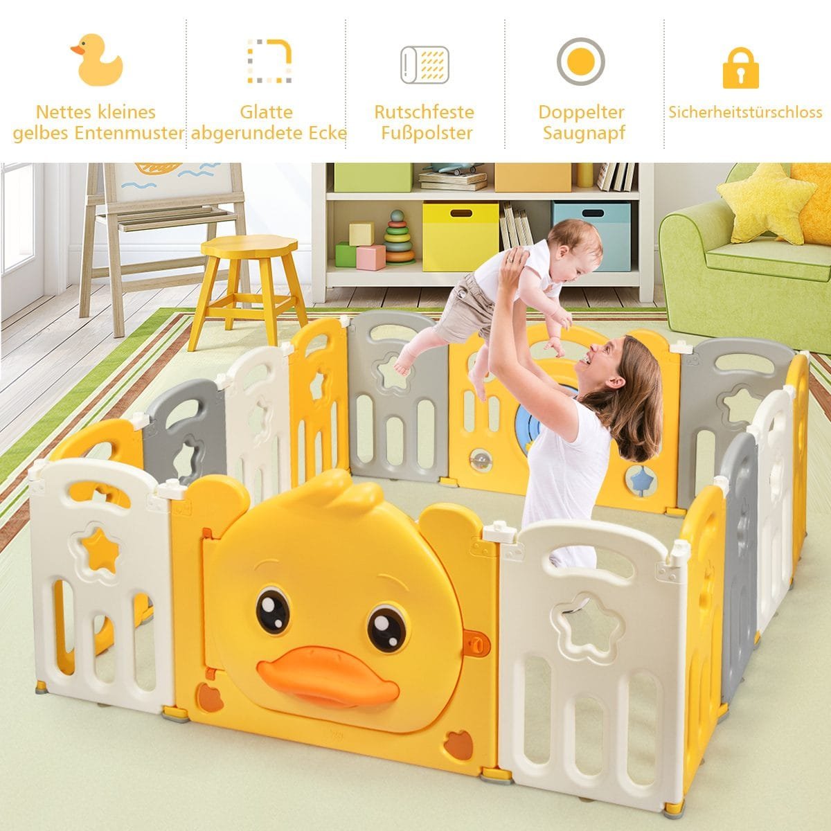 Vaikų žaidimų aptvaras su 14 panelių ir žaislų lentą (Geltona)