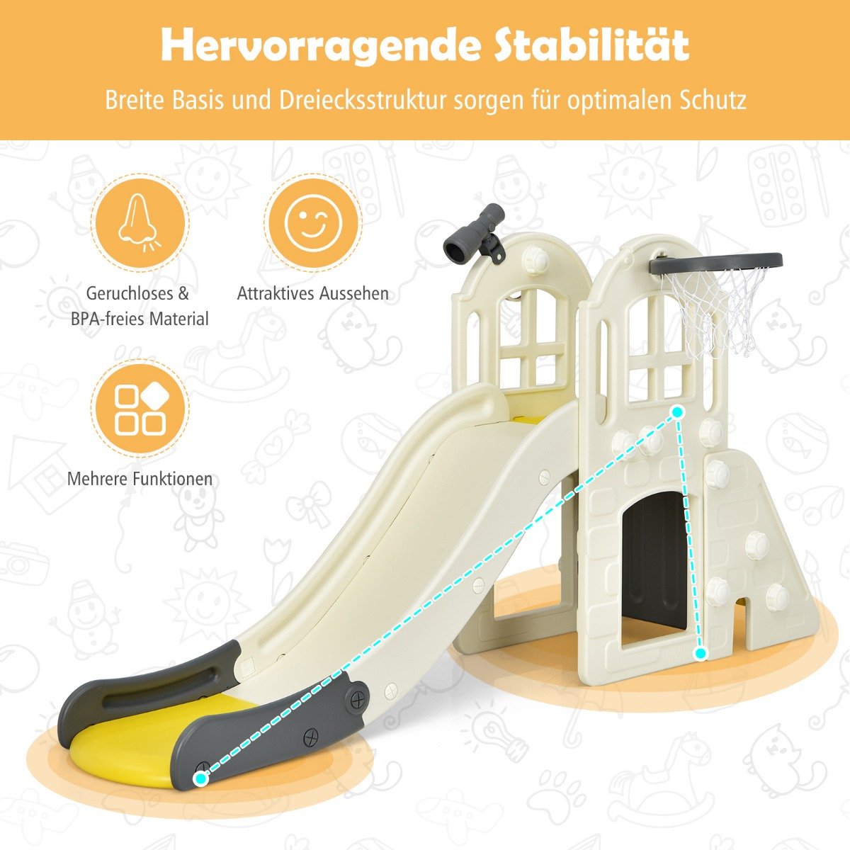- 6-in-1 žaidimų kompleksas: siūlo įvairias žaidimo galimybes – čiuožyklą, laipiojimo sienelę, tunelį, krepšinio lanką, žiedmetį ir teleskopą.
