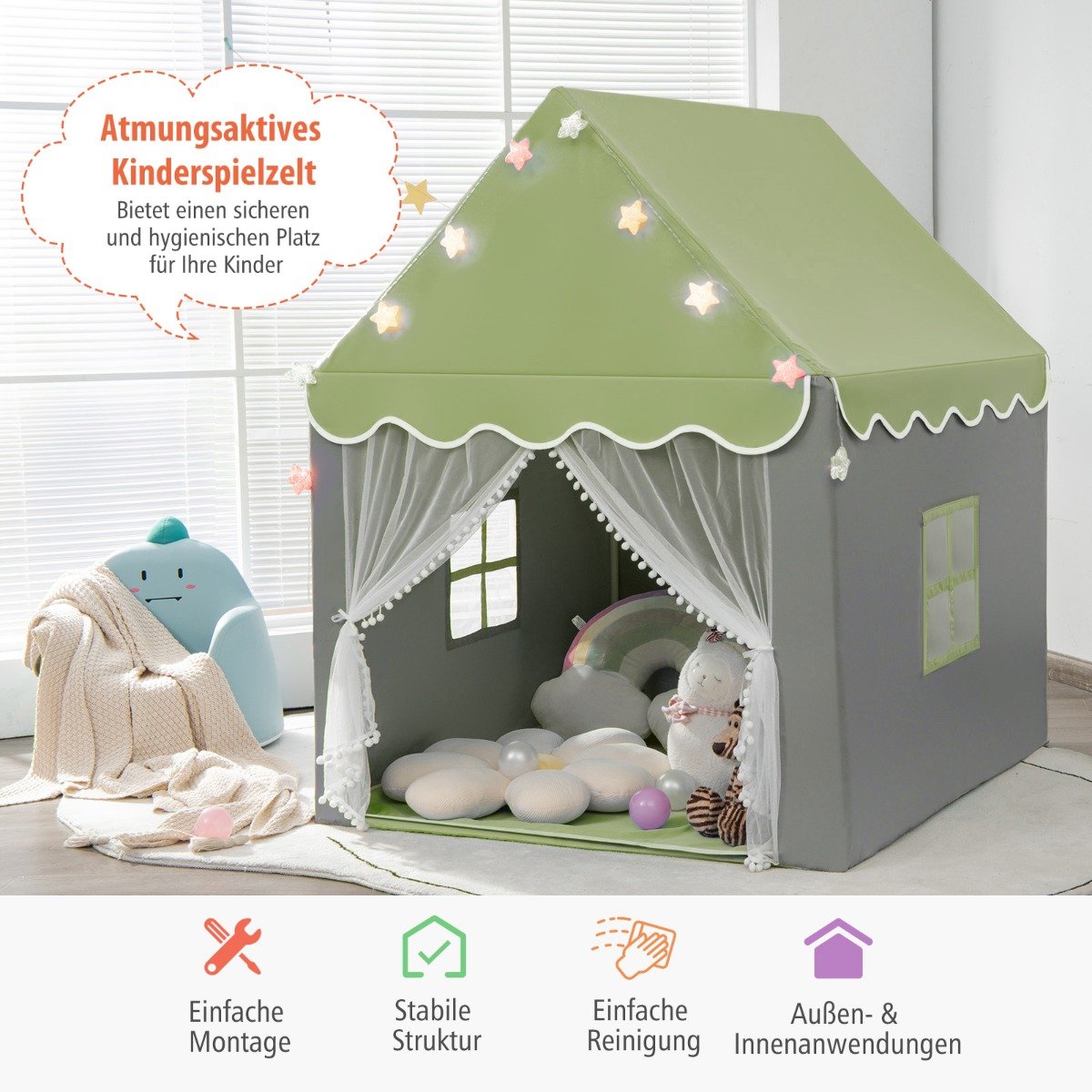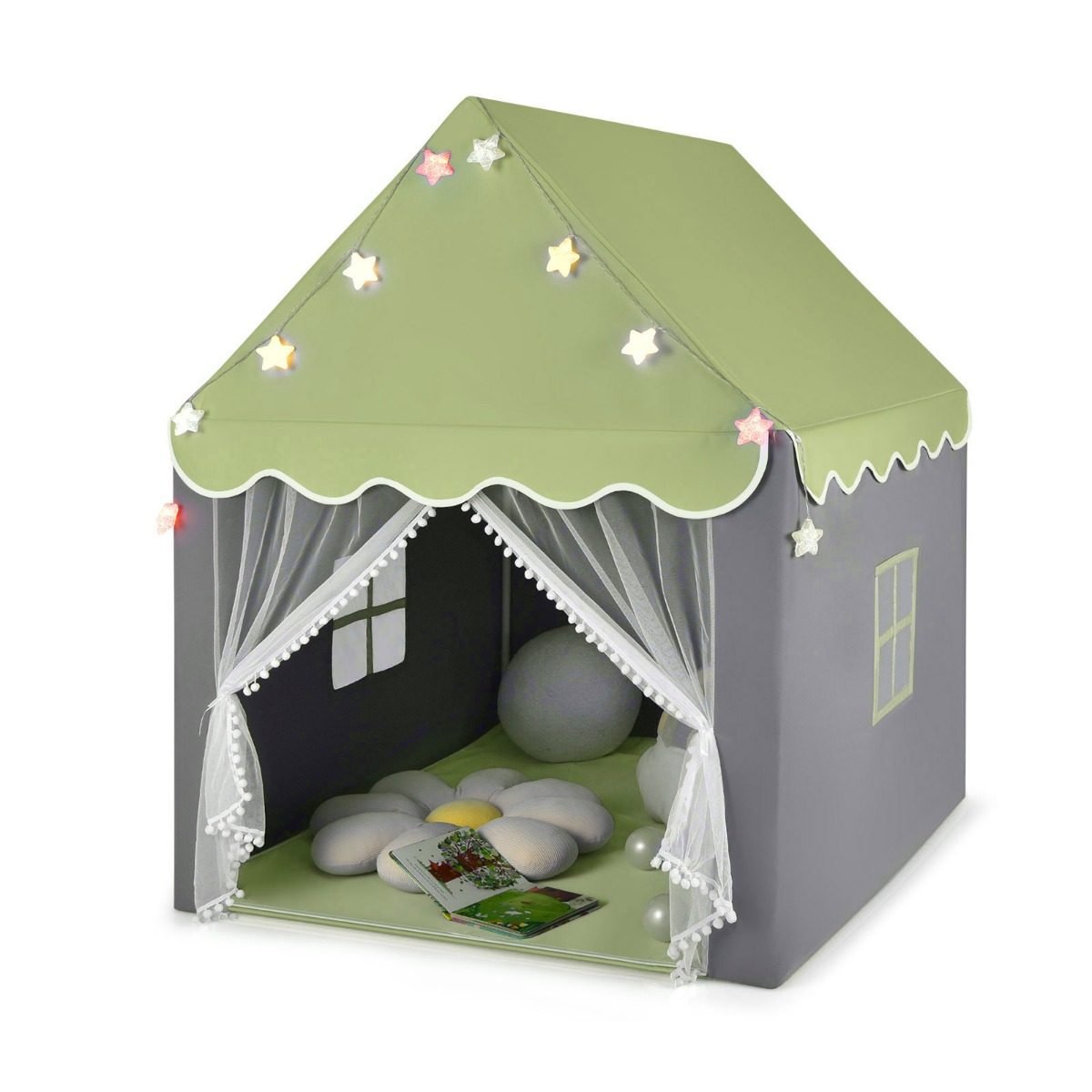 Vaikų žaidimų palapinė su švieselėmis ir langu (Žalia)