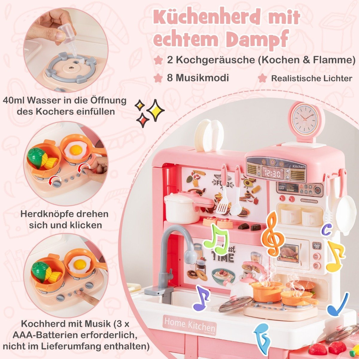 Vaikų žaidimų virtuvėlė su šviesa garsu ir 49 priedais (Rožinė)