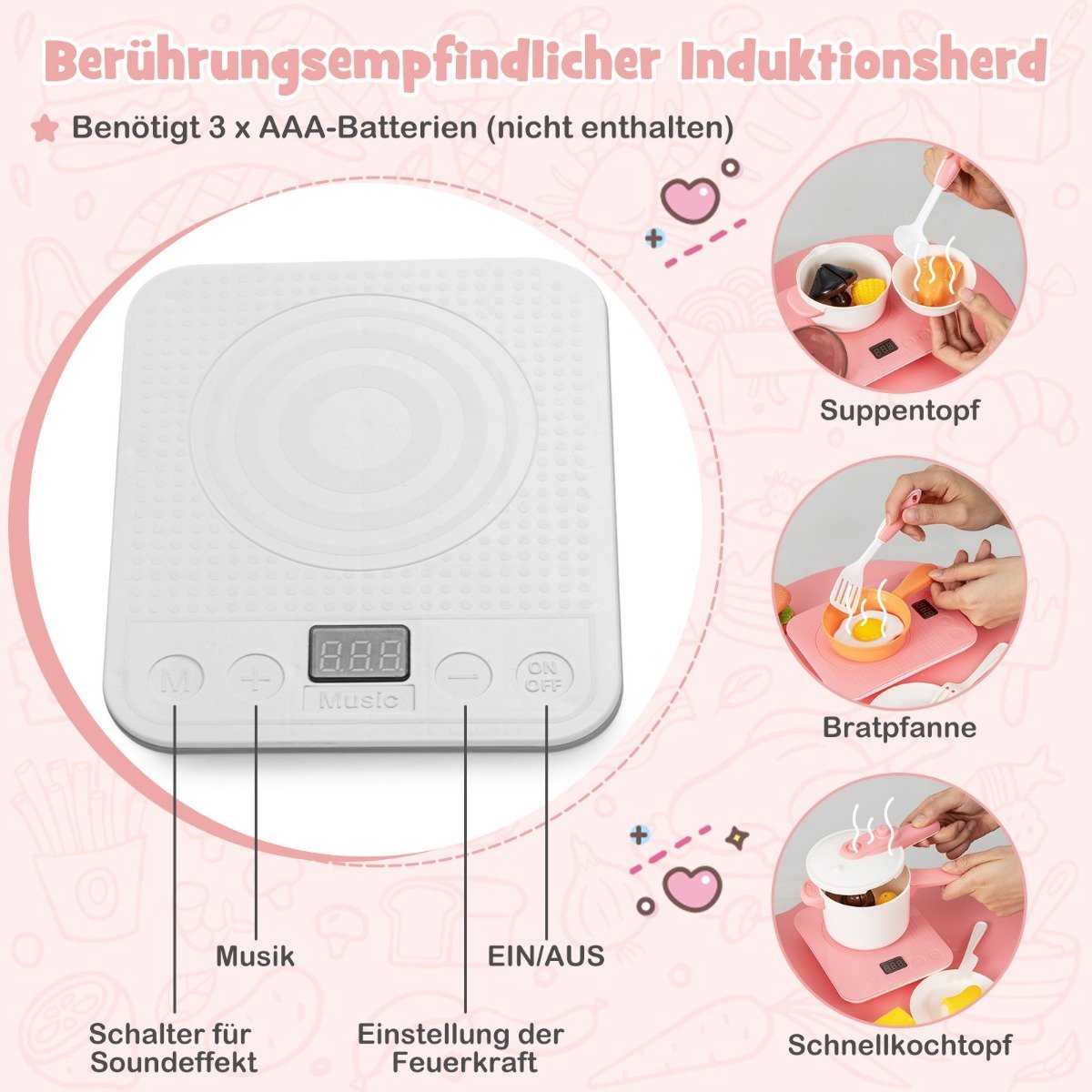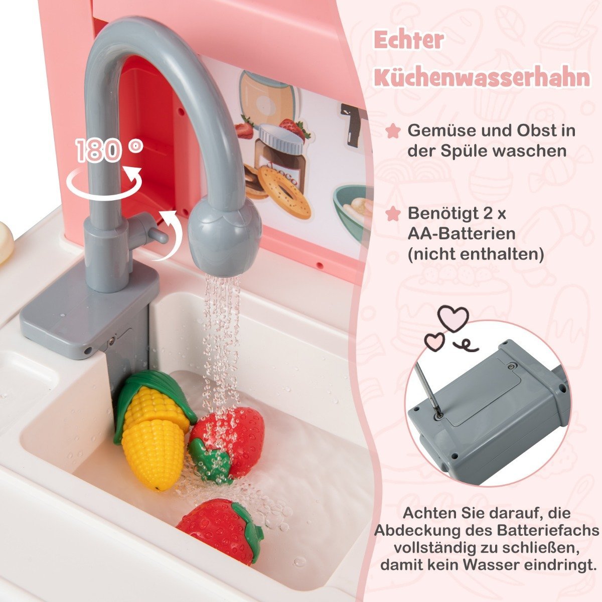 - Daugybė priedų, įskaitant pjaustomus vaisius ir daržoves, padeda ugdyti praktinius įgūdžius.