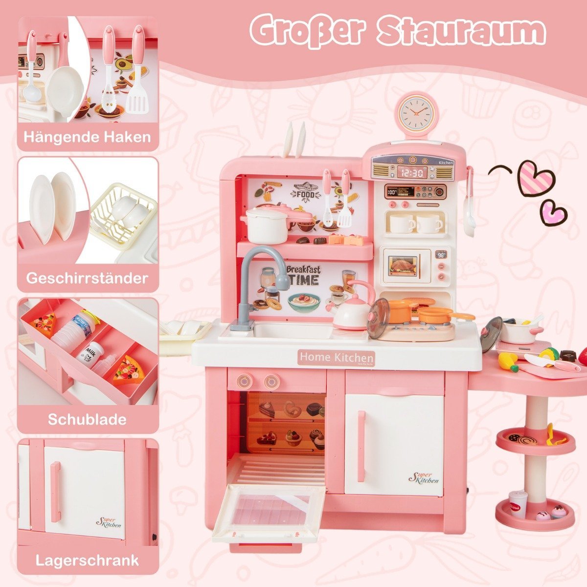 Atgaivinkite vaiko fantaziją su šiuo vaidmenų žaidimų virtuvėlės rinkiniu! Sukurtas skatinti vaizduotę, šis rinkinys apima interaktyvius žaidimų virtuvės įrankius ir aksesuarus, imituojančius tikrus maisto gaminimo vaidmenų žaidimus.
