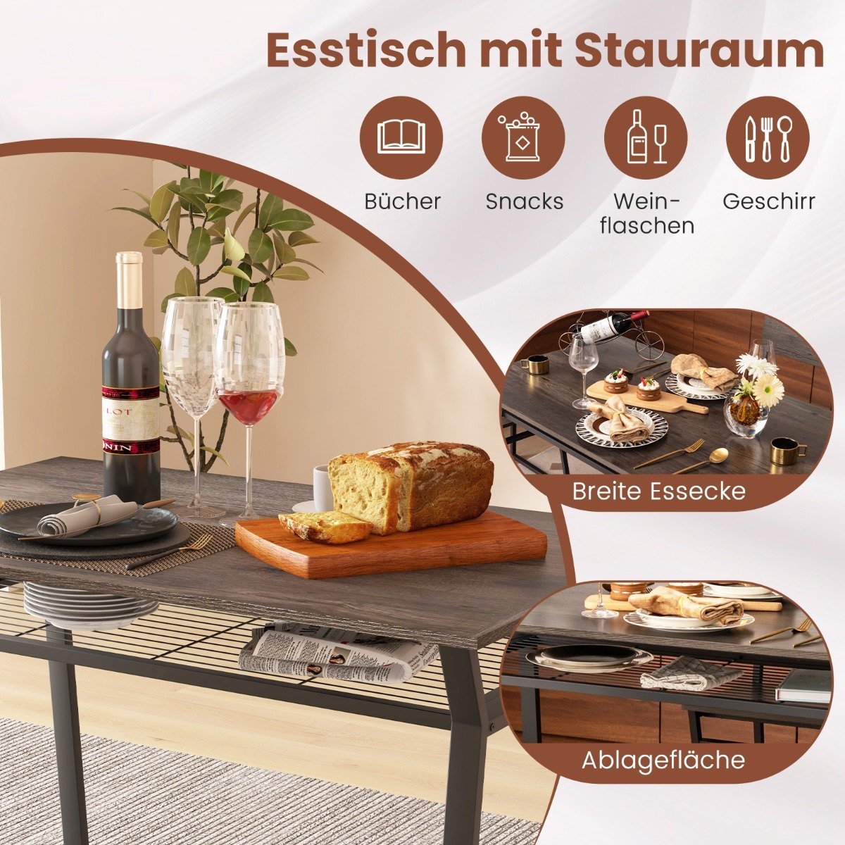 Atnaujinkite savo valgomojo zoną su šiuo elegantišku 5 dalių valgomojo baldų komplektu. Su stačiakampiu stalu ir 4 priderintomis kėdėmis, šis komplektas užtikrina patogią valgymo patirtį jums ir jūsų šeimai. Stalas turi papildomą lentyną, kurioje patogiai galėsite laikyti indus ir stalo įrankius, taip padedant palaikyti tvarkingą aplinką.