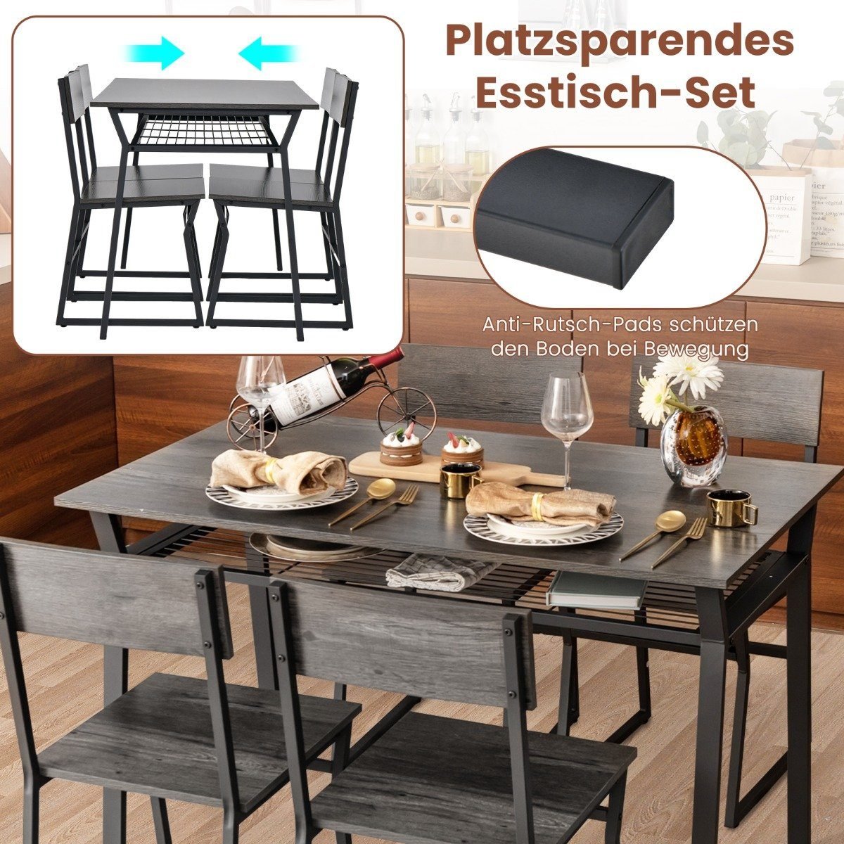 Valgomojo baldų komplektas su keturiomis kėdėmis ir lentyna (Pilka)