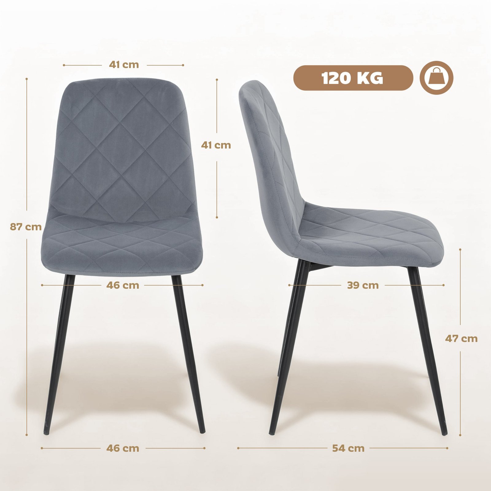 Mėgaukitės tobulu komforto ir stiliaus deriniu su šiomis valgomojo kėdėmis. Prabangus, aksominis audinys ir stabili atrama nugarai su paminkštinta sėdyne garantuoja maksimalų sėdėjimo komfortą. Tvirtos apmuštos kėdės konstrukcija su milteliniu būdu dengtu plieniniu rėmu ir grindų apsaugomis apsaugo jūsų grindis nuo įbrėžimų, o jos paprastas, modernus dizainas su subtiliomis siūlėmis pavers jas elegantišku akcentu bet kurioje patalpoje.