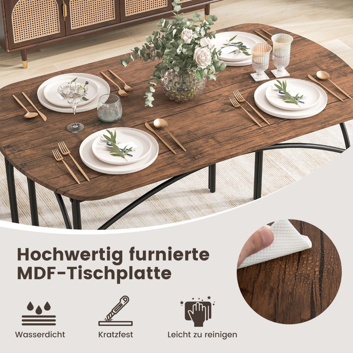 - Erdvus komplektas 4 asmenims: stačiakampis stalas ir 2 suolai užtikrina pakankamai vietos.