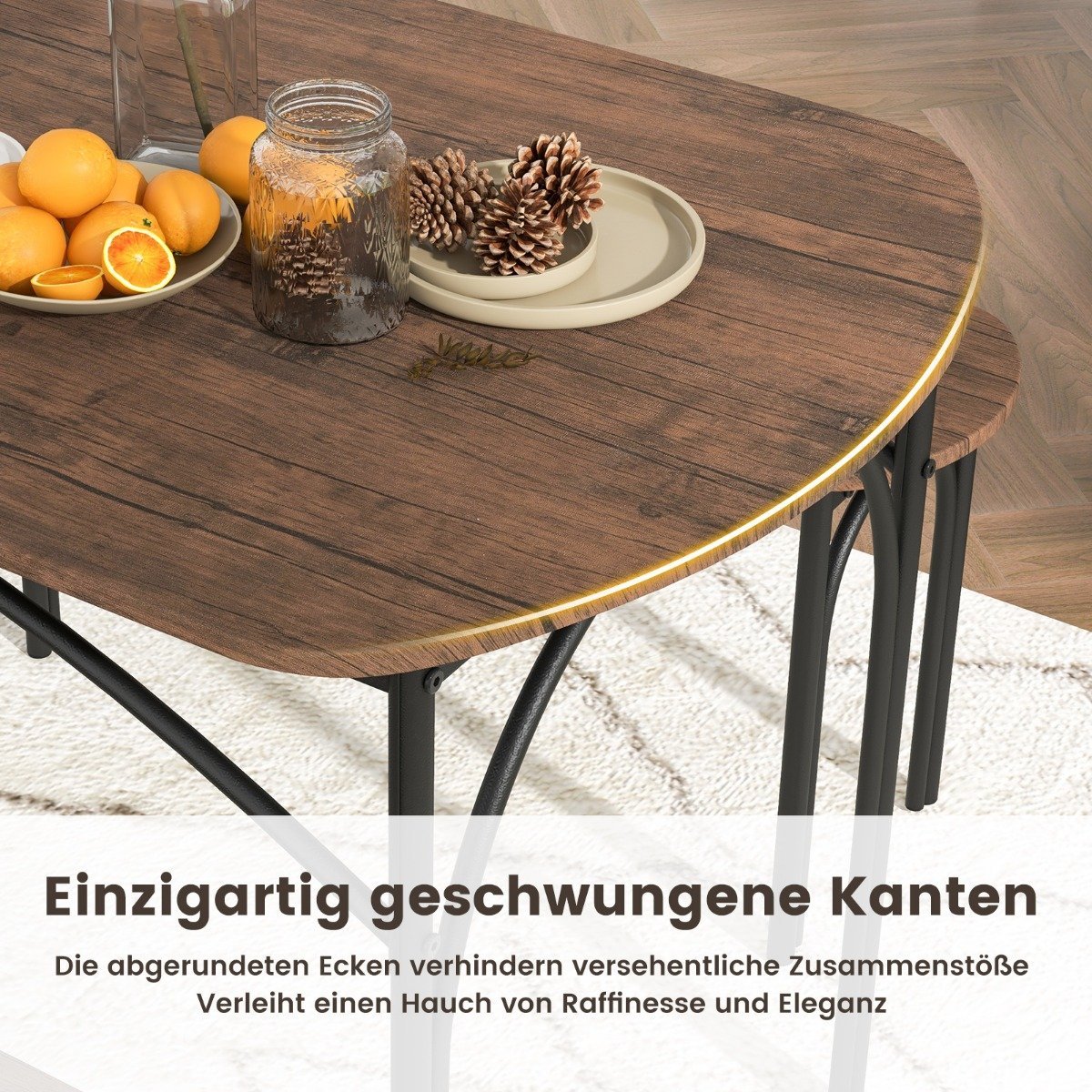 Mėgaukitės jaukiomis ir šiltomis akimirkomis su šeima bei draugais su šiuo 3 dalių valgomojo komplektu. Jį sudaro stalas ir du suolai, puikiai tinkantys įvairioms progoms – nuo šeimyninių vakarienių iki susibūrimų su draugais. Suolai patogiai paslėpiami po stalu, taip sutaupant vietos ir palengvinant erdvės tvarkymą.