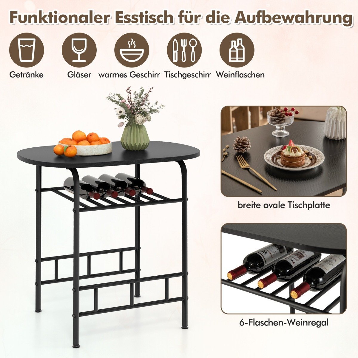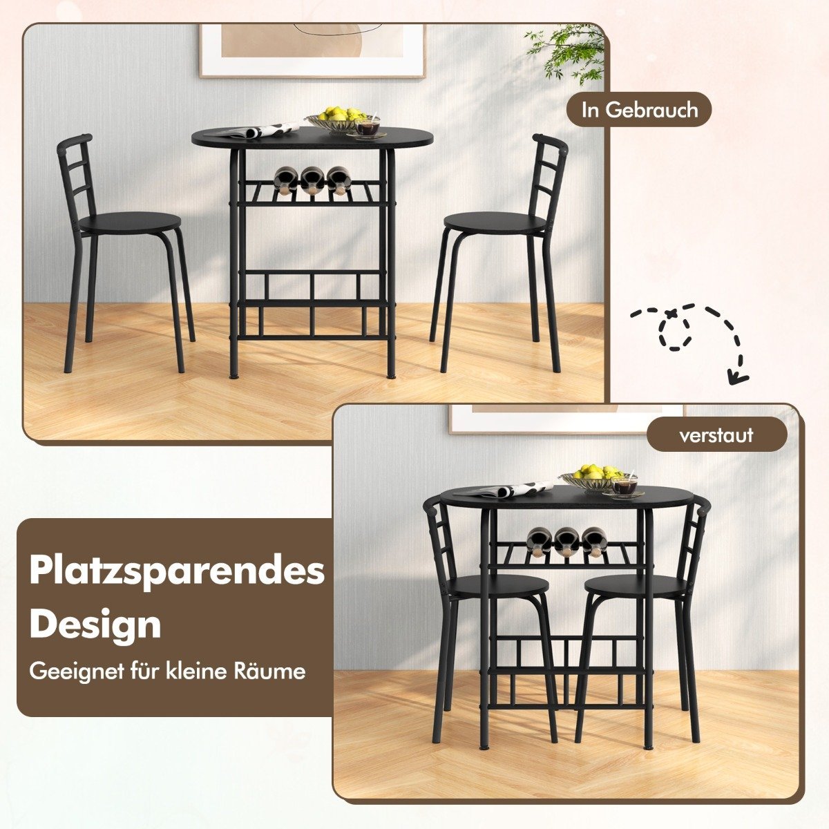 Valgomojo komplektas su dviem kėdėmis ir vyno laikikliu (Juoda)
