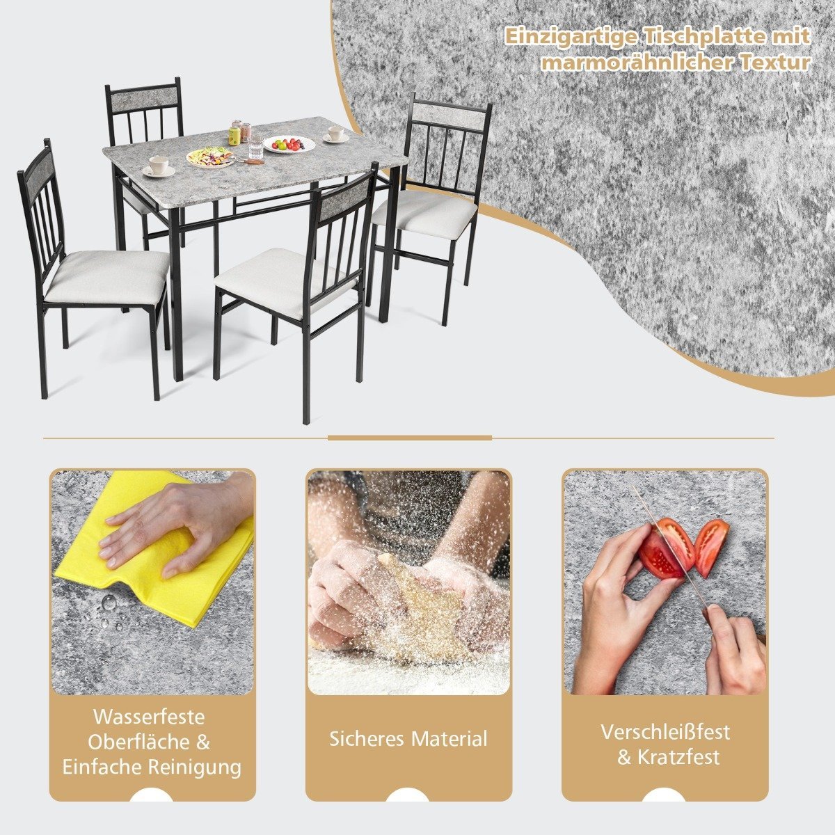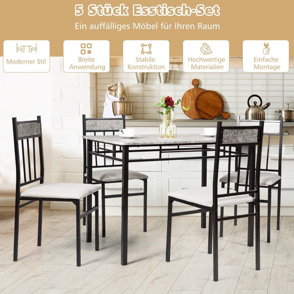 - Praktiškas 5 dalių komplektas: 1 stalas ir 4 kėdės.