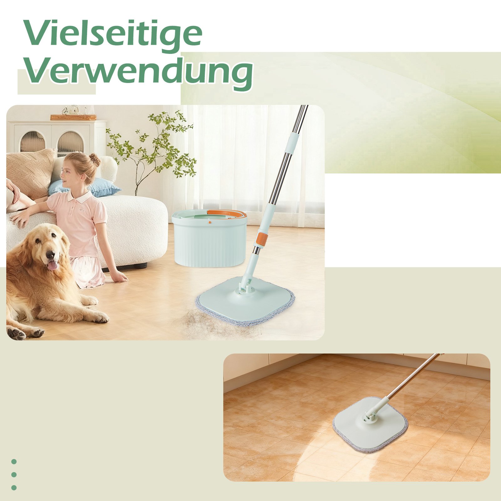 - 360° besisukanti mopo galvutė leidžia lengvai pasiekti sunkiai prieinamus kampus ir vietas po baldais.