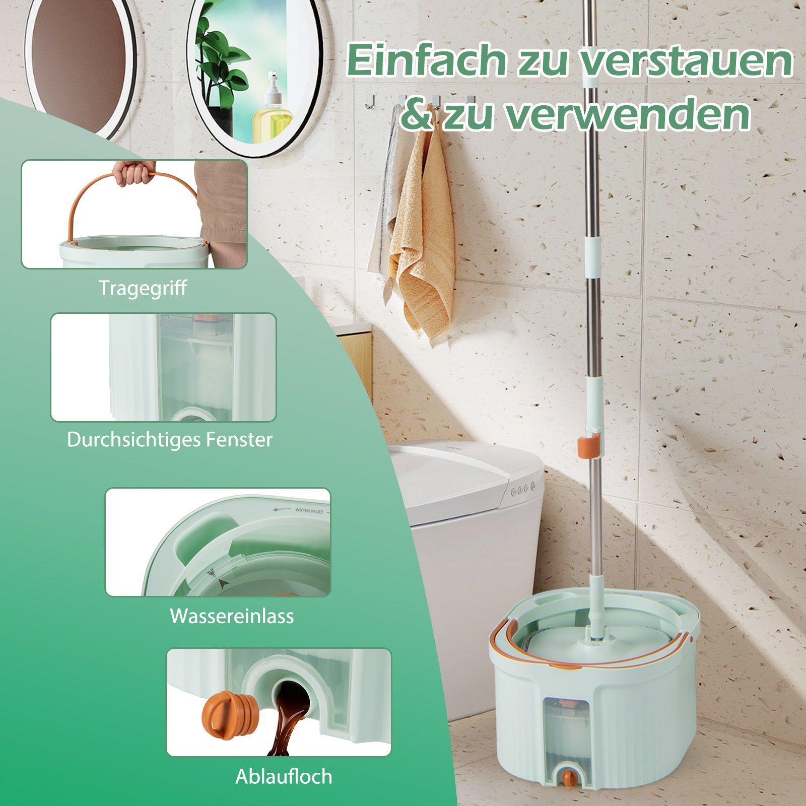 Patobulinkite savo valymo rutiną su šiuo besisukančiu mopu ir kibiro rinkiniu! Jo naujoviška vandens atskyrimo sistema efektyviai atskiria nešvarų vandenį nuo švaraus, užtikrindama, kad visada valytumėte tik švariu mopu. Su 360° pasukama mopo galvute, šis rinkinys lengvai pasieks kampus ir sunkiai prieinamas vietas po baldais. Be to, integruotos šukos efektyviai pašalins plaukus ir nešvarumus nuo mopo šluostės.