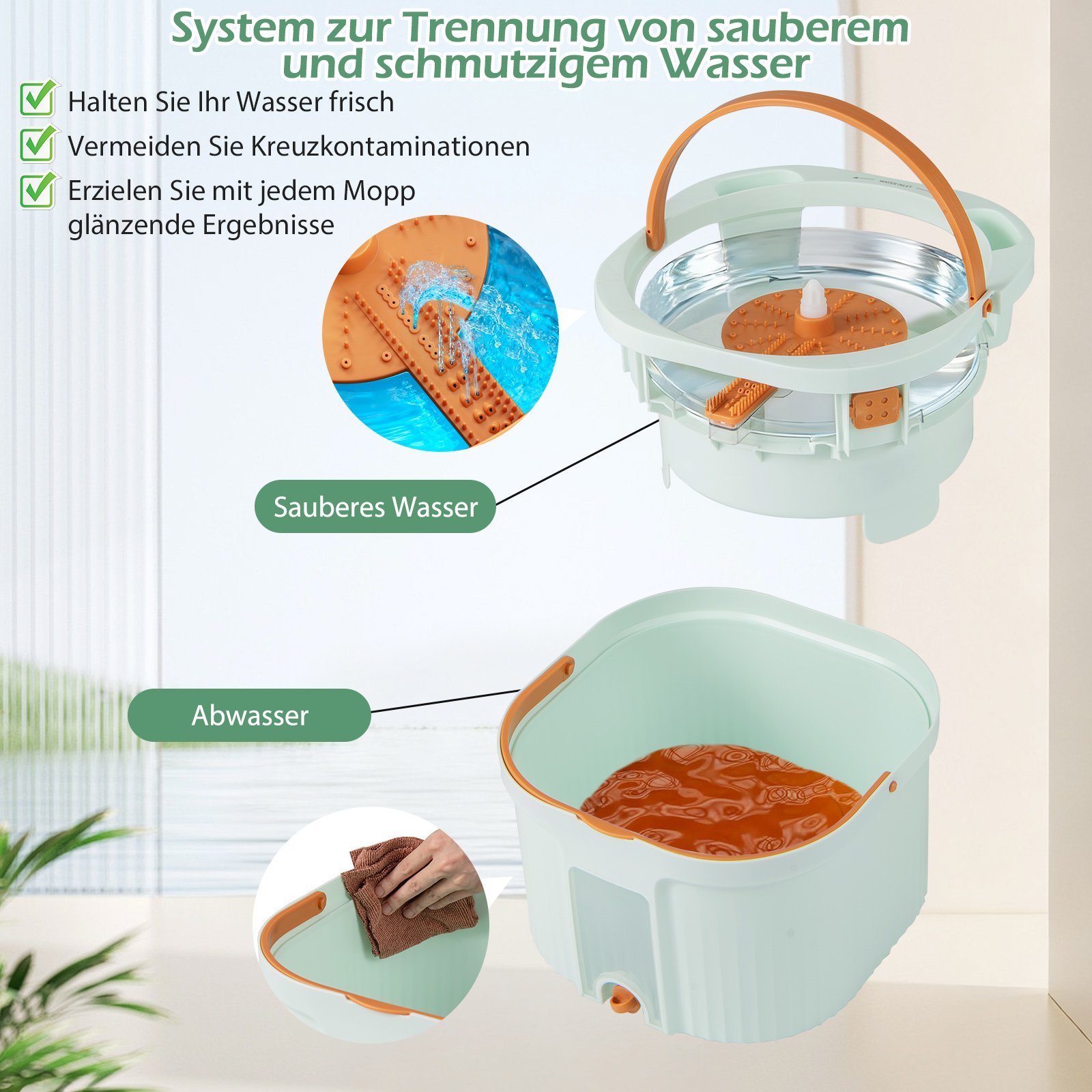 - Vandens atskyrimo sistema užtikrina, kad valysite visada tik švariu mopu.
