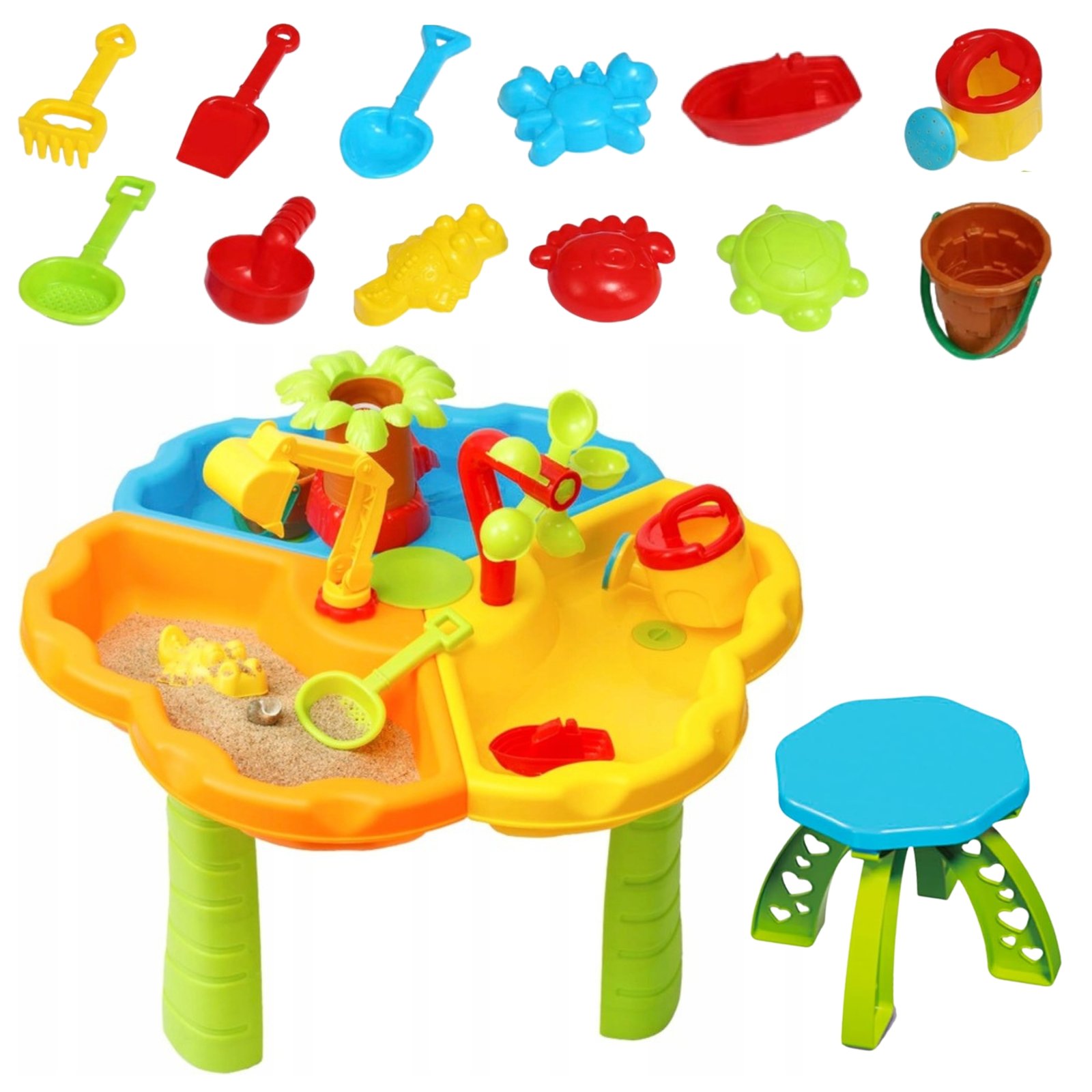 Pagamintas iš saugios, patvarios ir lengvai valomos medžiagos, be aštrių briaunų, staliukas yra visiškai saugus mažiesiems. Trijų skyrių konstrukcija leidžia vaikams vienu metu eksperimentuoti su įvairiomis tekstūromis ir medžiagomis: smėliu, vandeniu ir rinkinio priedais. Kiekvienas rinkinio elementas sukurtas skatinti vaikų vaizduotę – rasite mini ekskavatorių, medžio formos piltuvėlį, vandens malūnėlį, smėlio formeles, laivelį, kastuvėlius ir kitų spalvingų priedų. Taip vaikas gali žaisti vaidmeninius žaidimus, kurti smėlio figūras, perpilti vandenį, statyti ir eksperimentuoti – mokydamasis žaisdamas.