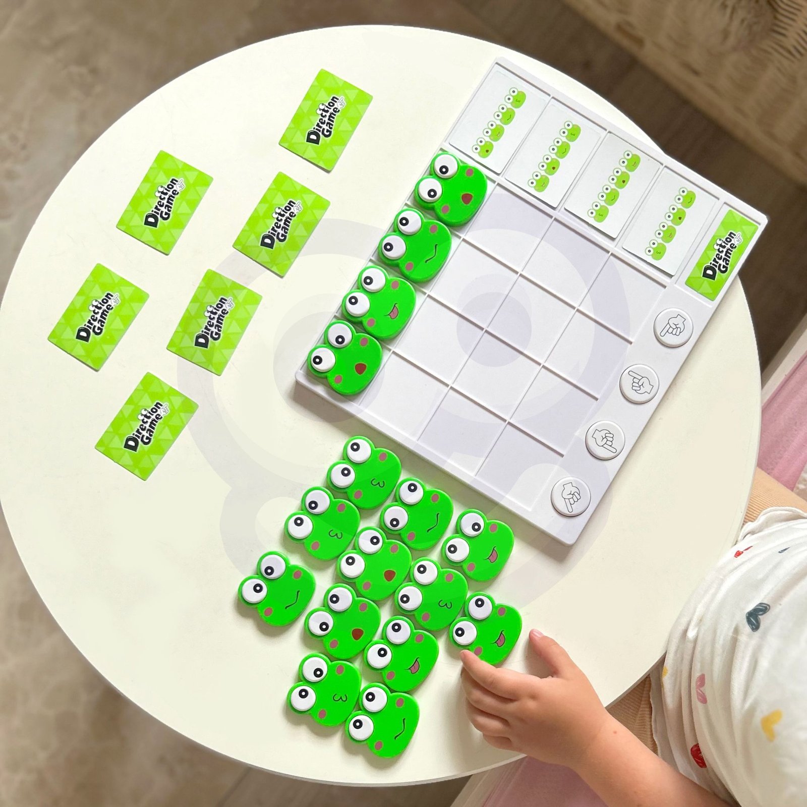 - Rinkinį sudaro: 1 žaidimo lenta, 4 varlės su skirtingomis veido išraiškomis, 24 kortelės su pavyzdžiais.