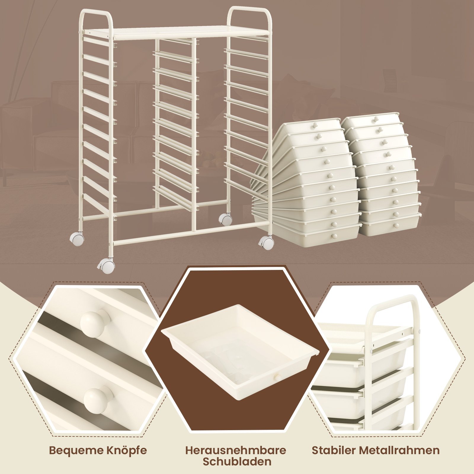 Vežimėlis su metaliniu rėmu ir 20 stalčių (Balta)