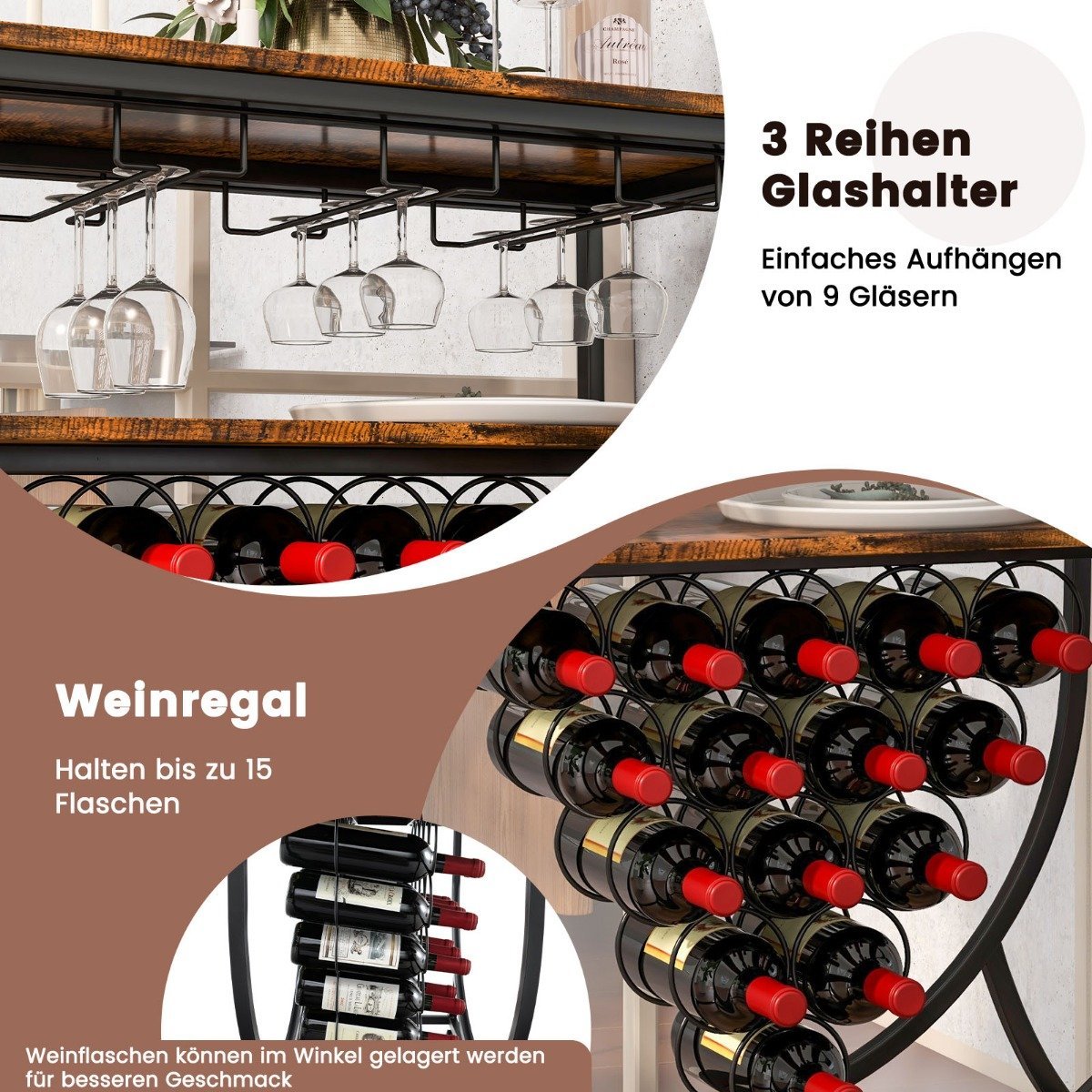 - Talpus: 2 atviros lentynos, laikiklis 15 vyno butelių ir 3 eilių laikiklis stiklinėms.