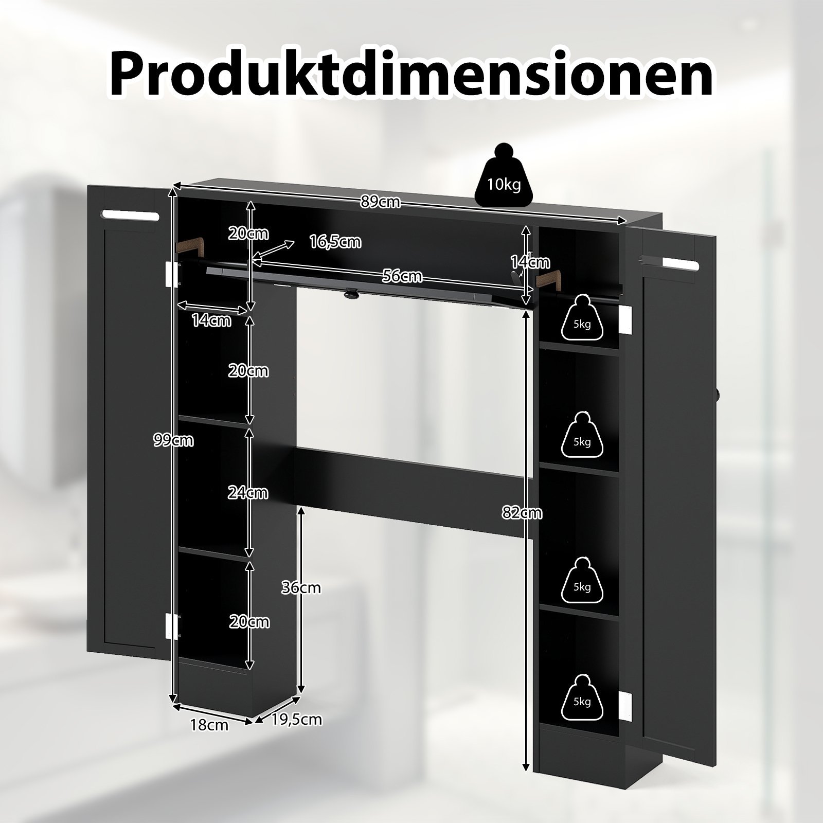 - Bendri matmenys (I x P x A): 89 x 19,5 x 99 cm