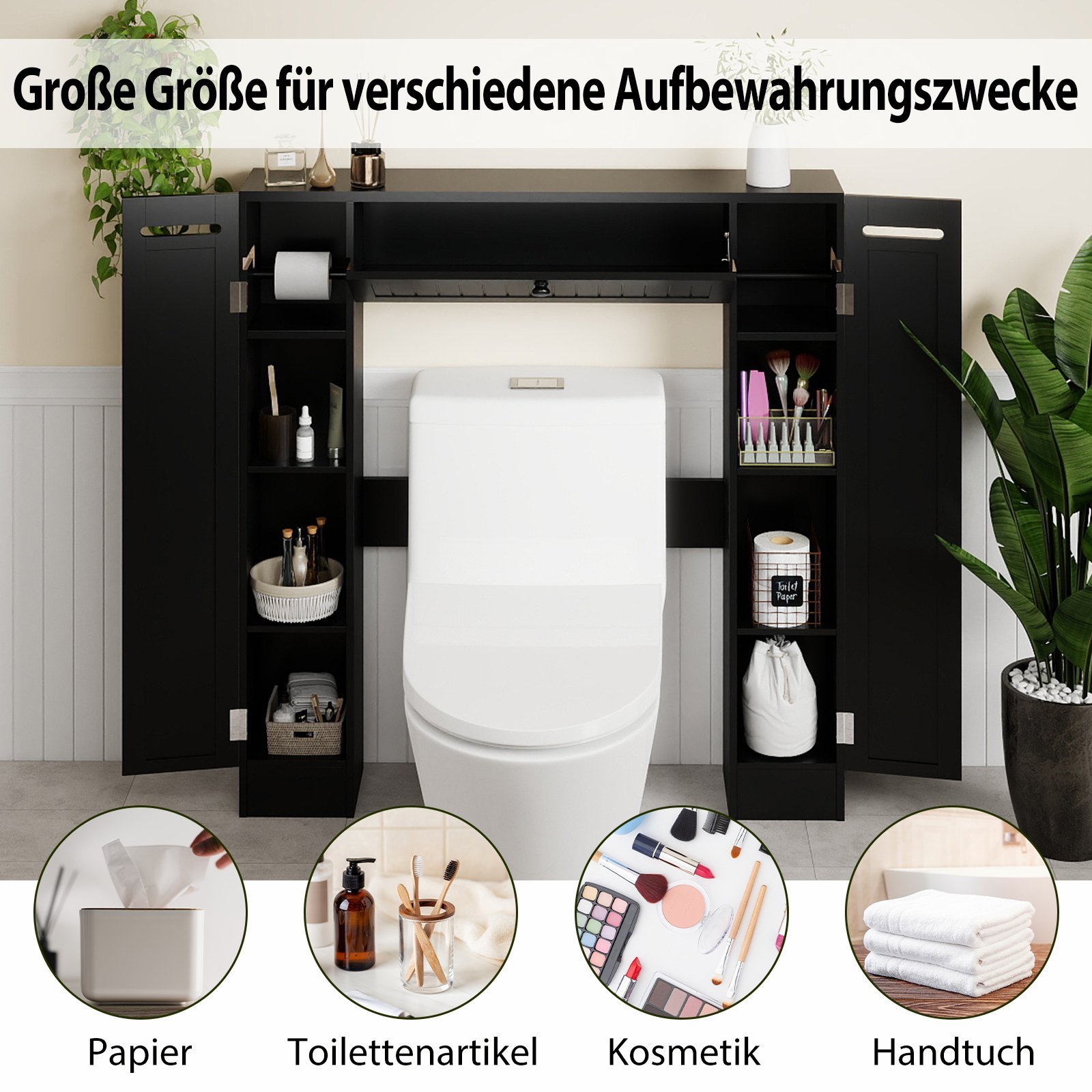 - Suteikia daug vietos tualetiniam popieriui, higienos reikmenims, kosmetikai ir rankšluosčiams.