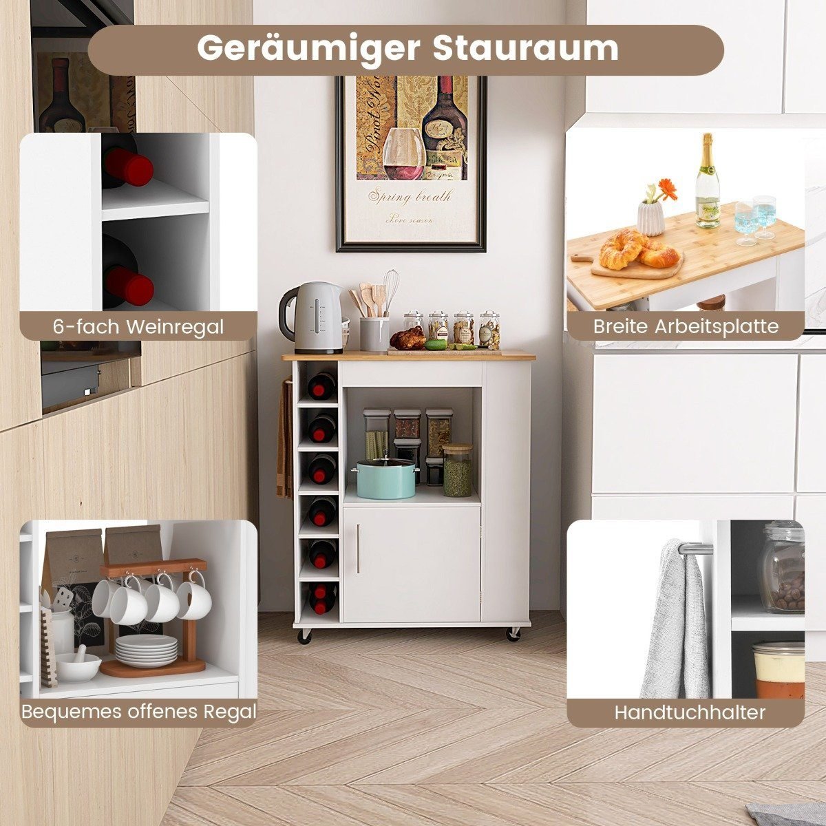 - Daugybė laikymo galimybių: platus stalviršis, atviros lentynos, 6 butelių vyno laikiklis, šoninė prieskonių lentynėlė, spintelė ir rankšluosčių laikiklis.