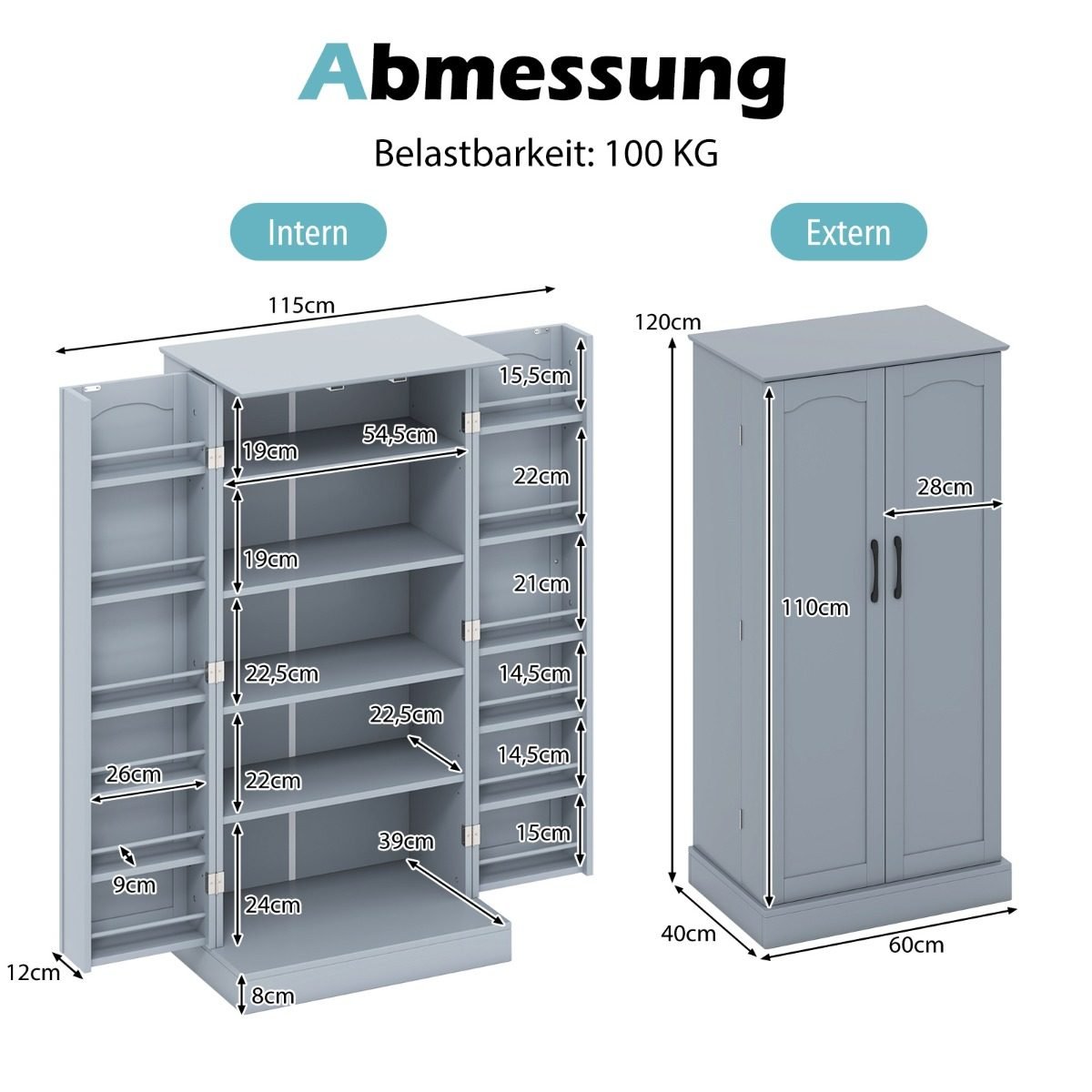 - Bendri išoriniai matmenys: 60 x 40 x 120,5 cm (Ilgis x Plotis x Aukštis)