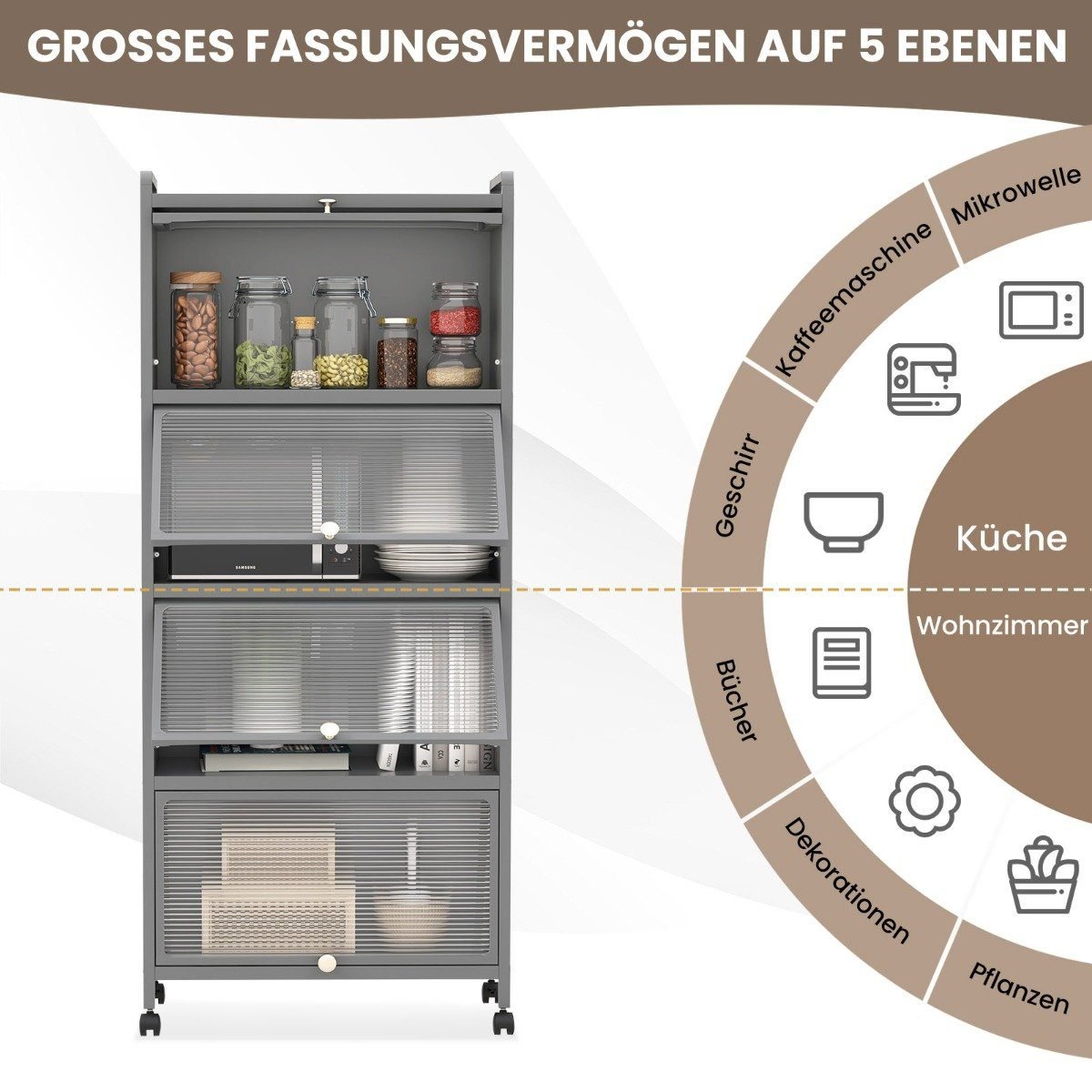 Sukurtas tvarkai ir stiliui jūsų virtuvėje! Ši ratukuota virtuvės spintelė yra puikus sprendimas daiktų laikymui. Su penkiais skyriais ir pusiau permatomomis durimis, ji apsaugo nuo dulkių ir leidžia tvarkingai laikyti virtuvės reikmenis, indus, užkandžius ir kt.