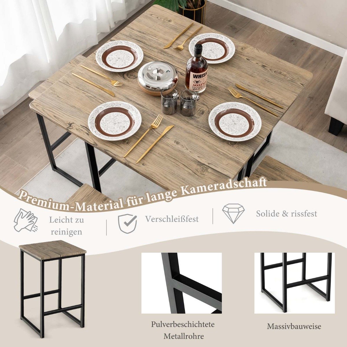 Sukurkite modernią ir funkcionalią valgomojo erdvę su šiuo 5 dalių valgomojo stalo ir kėdžių komplektu. Elegantiško dizaino, jis puikiai tiks tiek kasdieniams susibūrimams, tiek jaukiam laiko leidimui su šeima ar draugais.