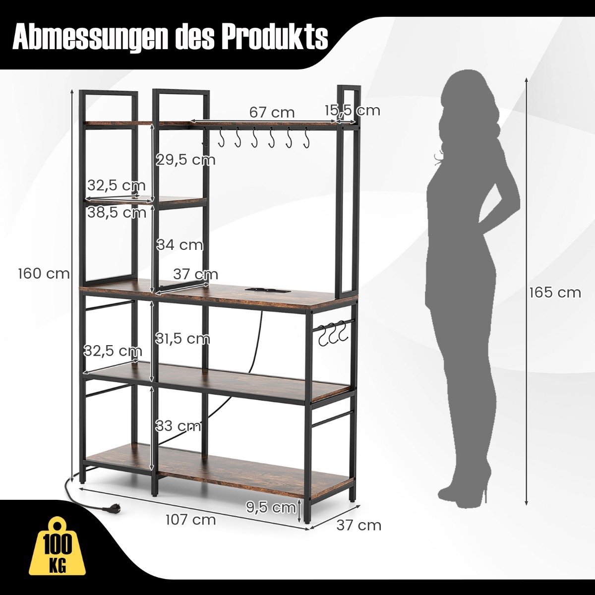 Virtuvės stovas su 5 lentynomis ir integruota įkrovimo stotele (Rustikali ruda)