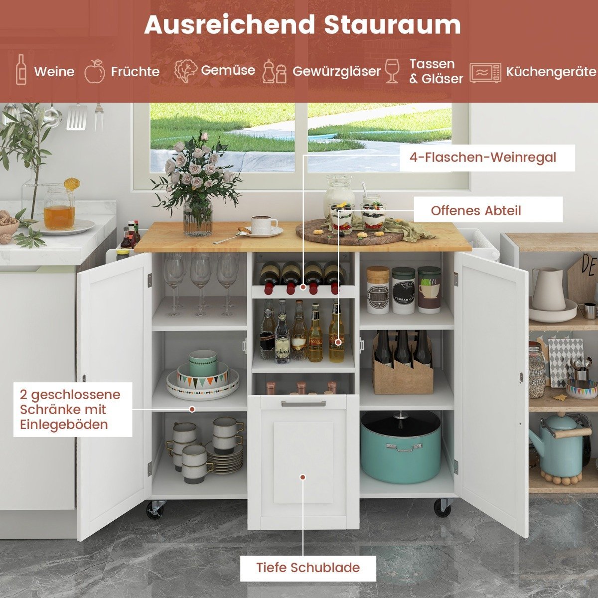 - Universalus panaudojimas: gali būti naudojamas kaip virtuvės vežimėlis, papildomas stalviršis ar net vyno spintelė.