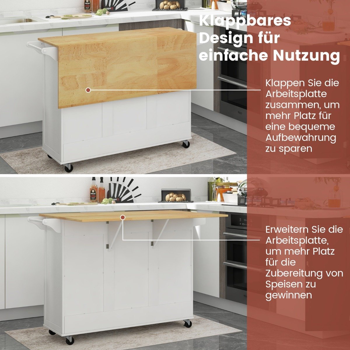 Ieškote virtuvės vežimėlio, kuris suteiktų papildomos laikymo vietos? Šis ratukinis virtuvės vežimėlis taps puikiu pagalbininku jūsų virtuvėje. Jo išskleidžiama akacijos medienos lentyna suteikia papildomos erdvės, pakėlus viršutinę dalį, o prireikus ją lengvai sulenksite.
