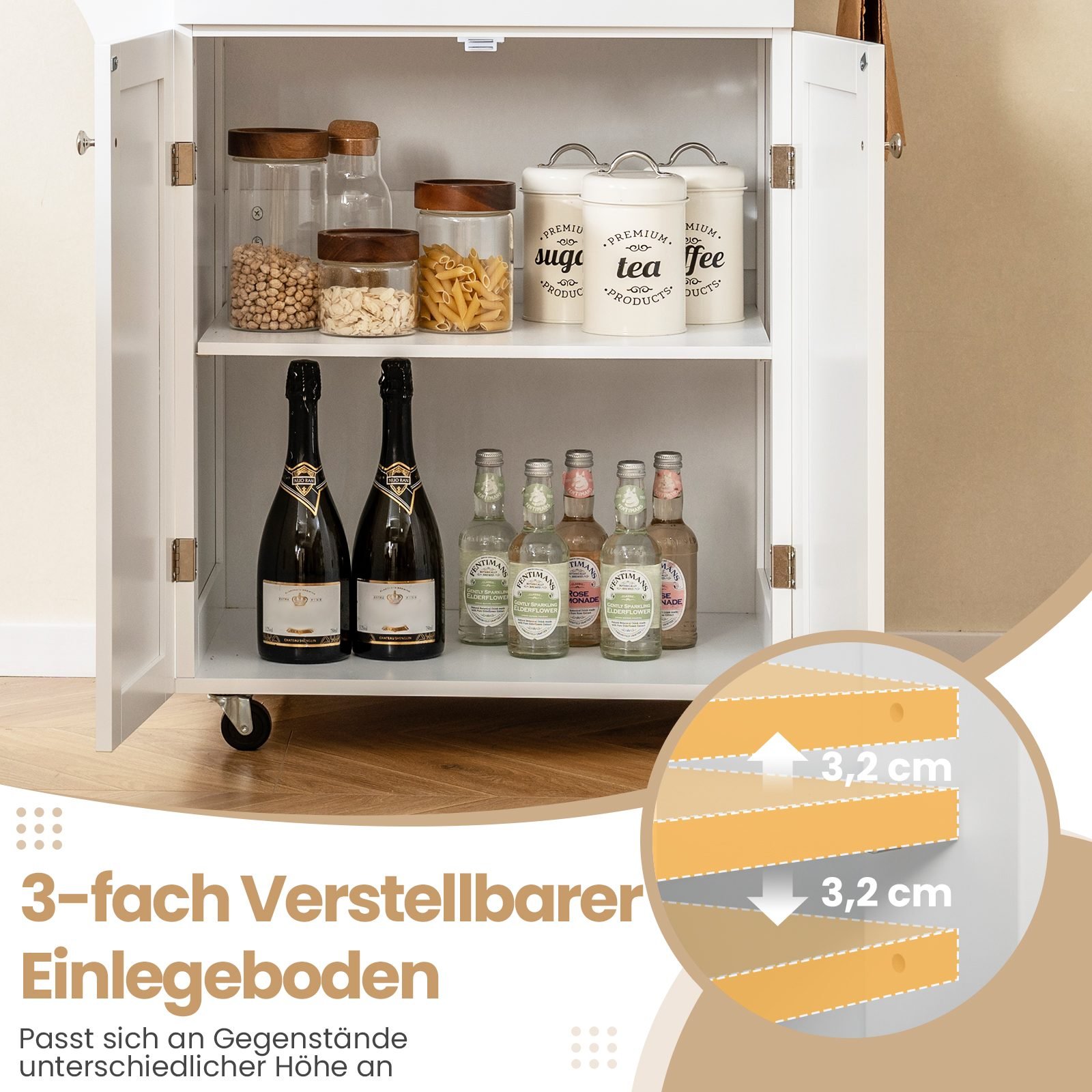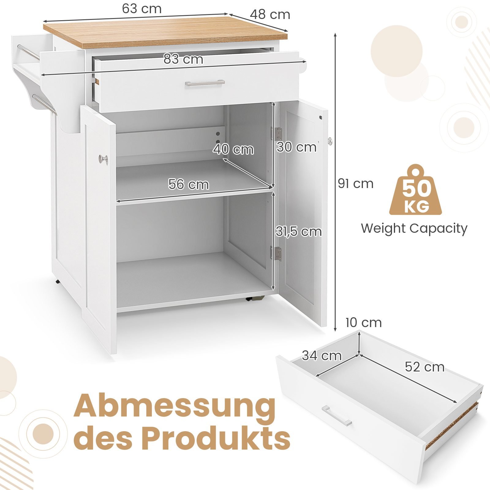 Šis funkcionalus virtuvės vežimėlis – puikus sprendimas norintiems padidinti virtuvės erdvę ir palaikyti joje tvarką. Jo universalus dizainas puikiai dera bet kokioje virtuvėje, valgomajame ar net svetainėje.