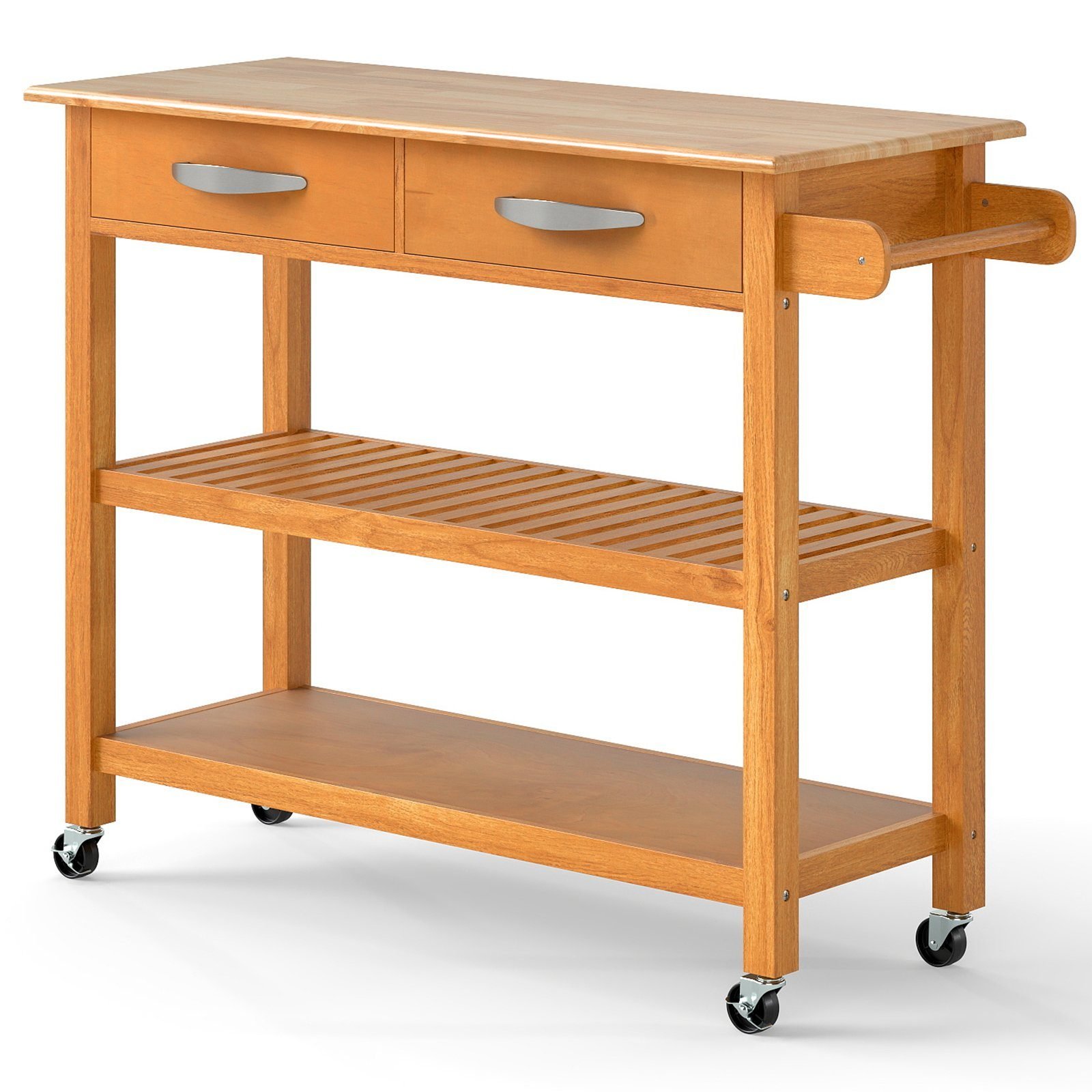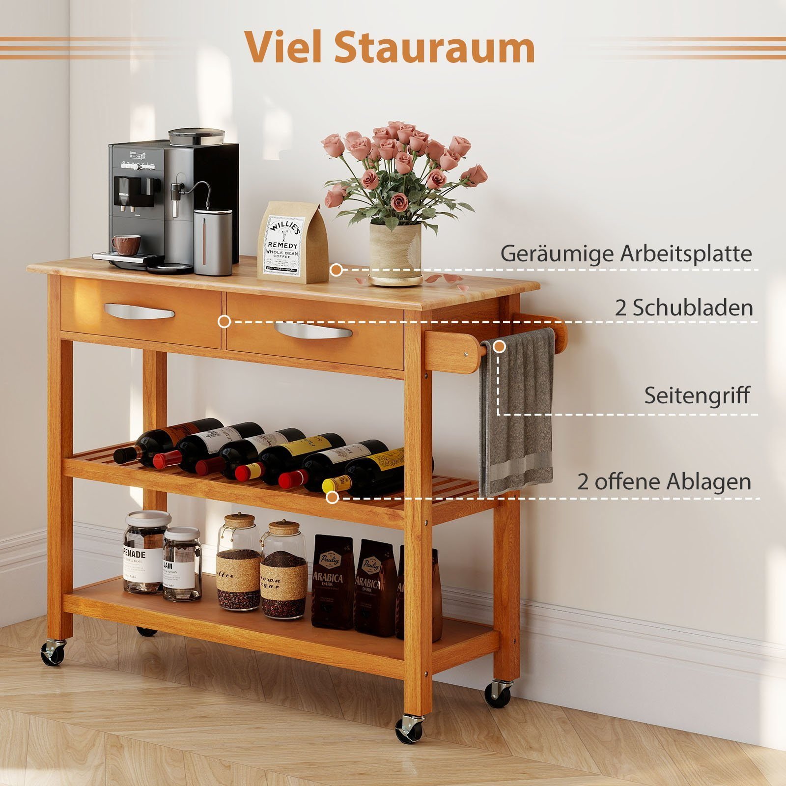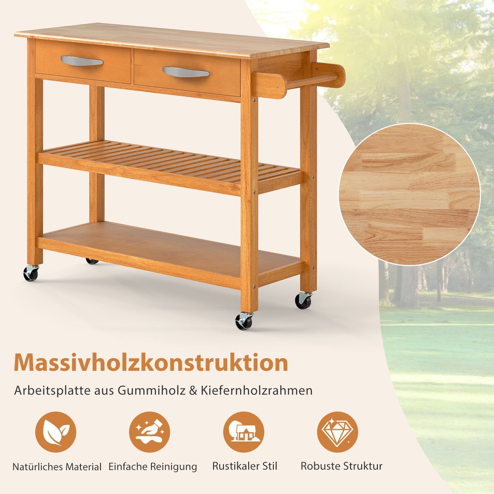 Padidinkite savo virtuvės funkcionalumą su šiuo patogiu virtuvės vežimėliu. Jo erdvi medinė plokštė puikiai tiks ruošiant maistą ar patiekiant patiekalus, o talpios lentynos ir stalčiai užtikrins tvarką ir lengvą priėjimą prie visų reikalingiausių virtuvės reikmenų.