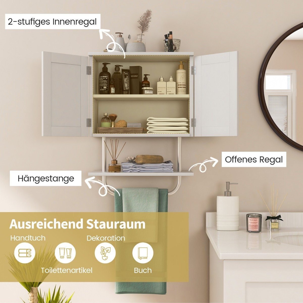 Vonios kambario sieninė spintelė su lentynomis (Balta)