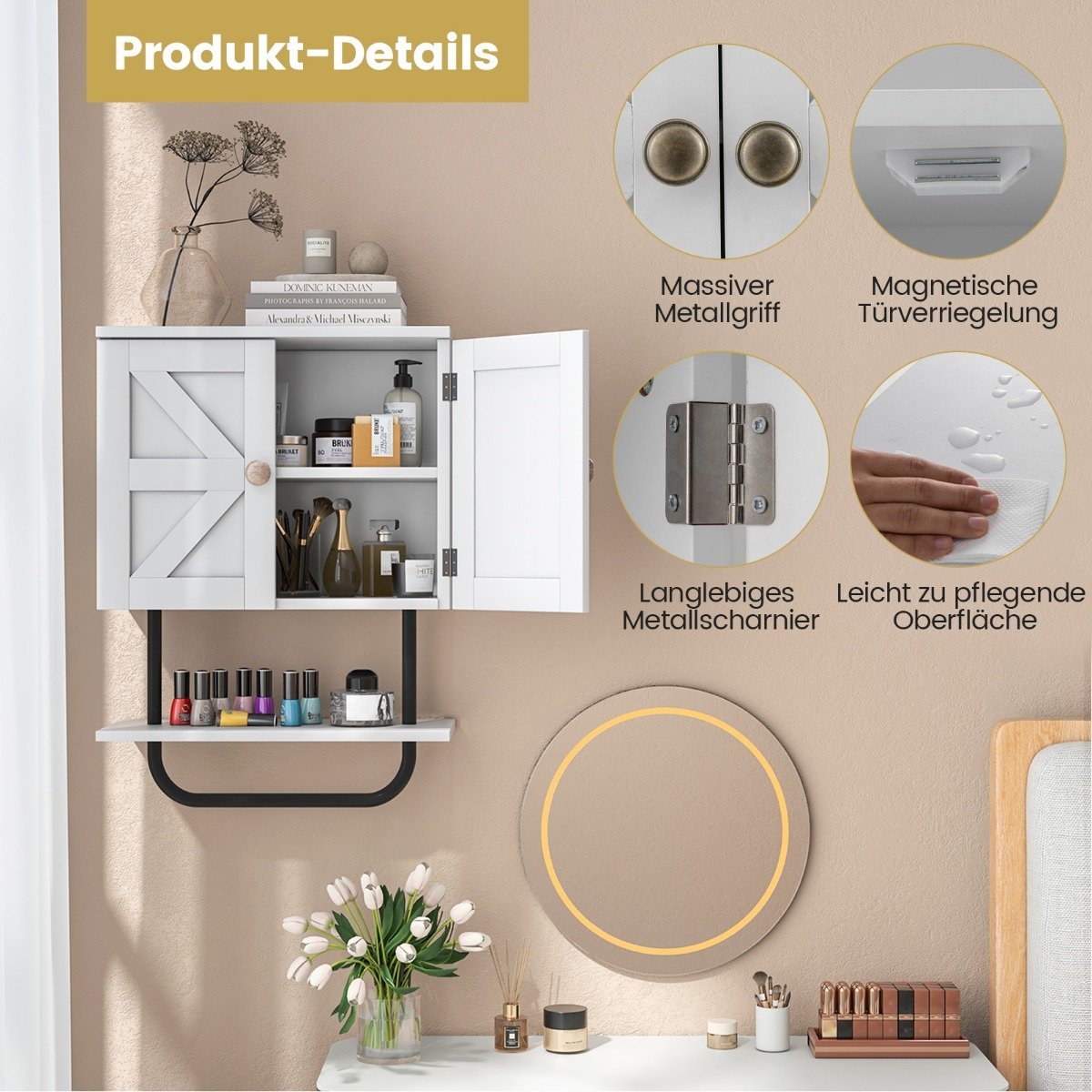 - Tvirtinama prie sienos, taupo vietą ir efektyviai išnaudoja vertikalią erdvę.