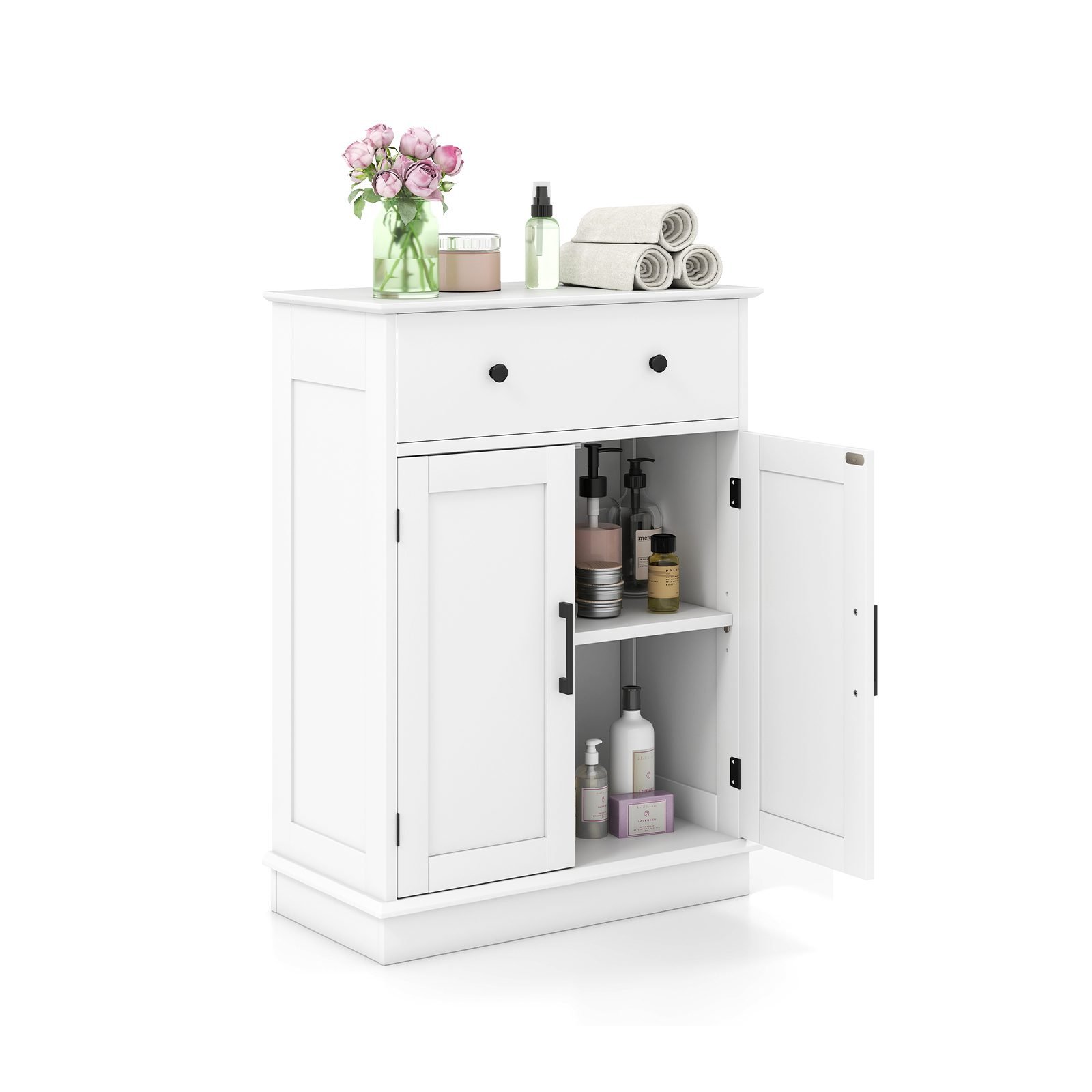 Padidinkite savo namų funkcionalumą ir stilių su šia universalia vonios spintele. Ji siūlo daug vietos daiktams laikyti: talpų stalčių ir uždarą spintelę su reguliuojama lentyna.