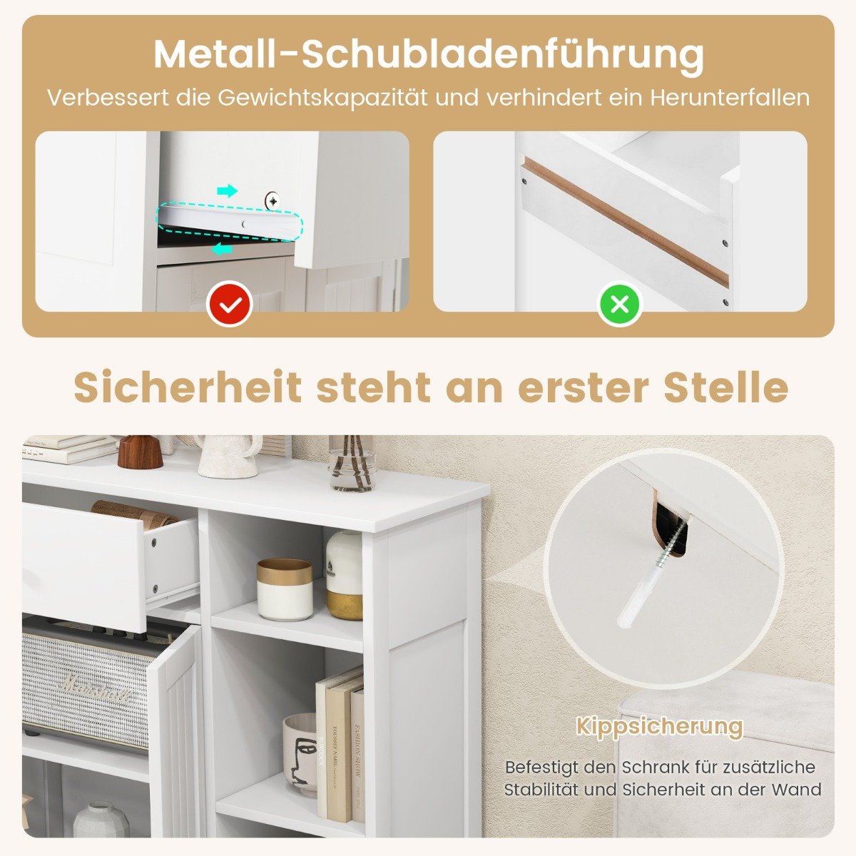 Tvarkingai sutvarkykite savo namus su šia funkcionalia vonios spintelė. Ji suteikia daug vietos daiktams laikyti, derindama atvirą ir uždarą saugojimo erdvę.