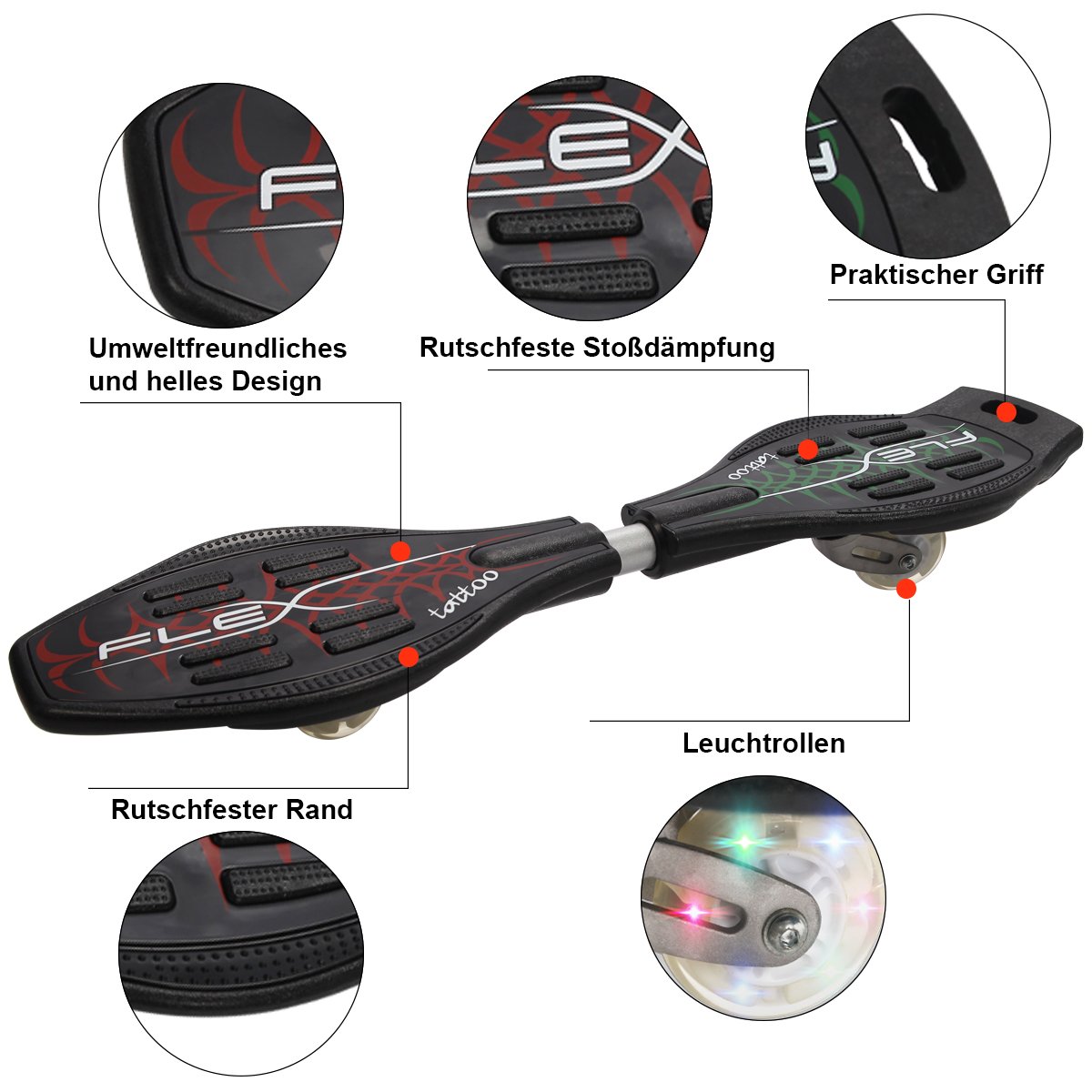 Leiskitės į nuotykius su šia Waveboard riedlente, kuri sujungia riedlentės, snakeboard’o ir banglentės geriausias savybes! Dėl unikalios dviejų dalių konstrukcijos su lanksčiu jungimu, ji suteikia ypatingą manevringumą ir naują važiavimo patirtį. Šviečiantys ratai ne tik atrodo įspūdingai, bet ir užtikrina matomumą tamsoje, paverčiant jus tikru traukos centru.