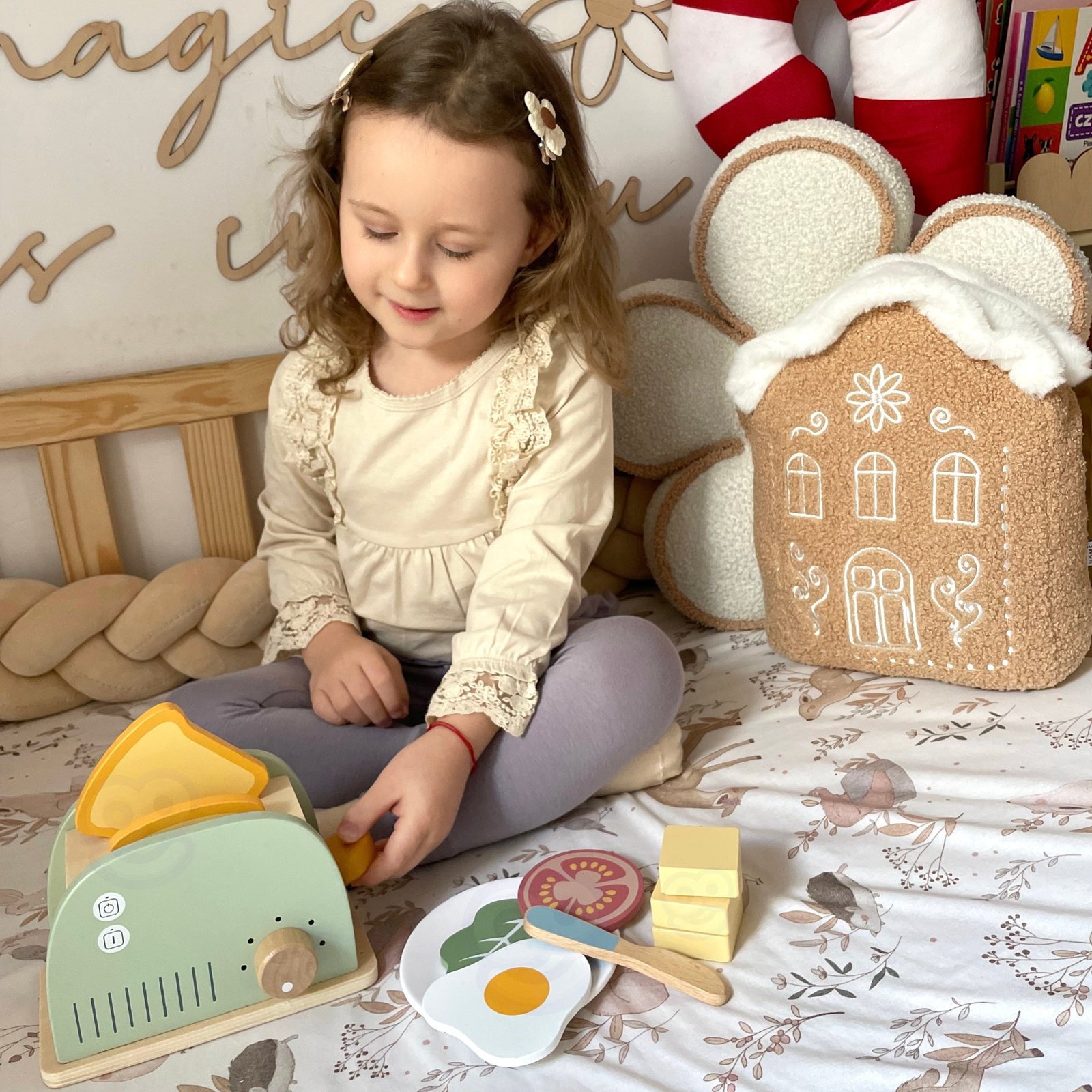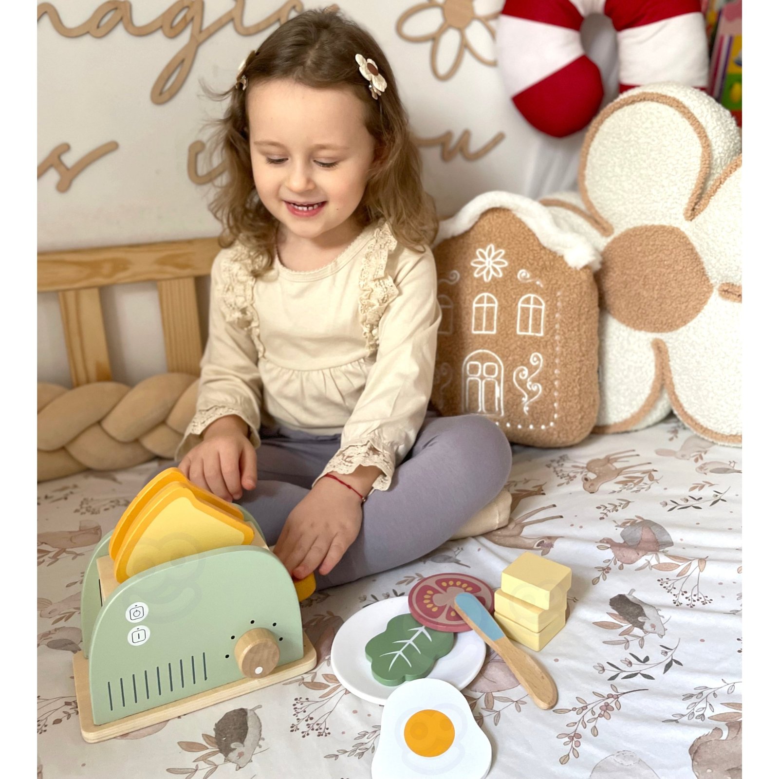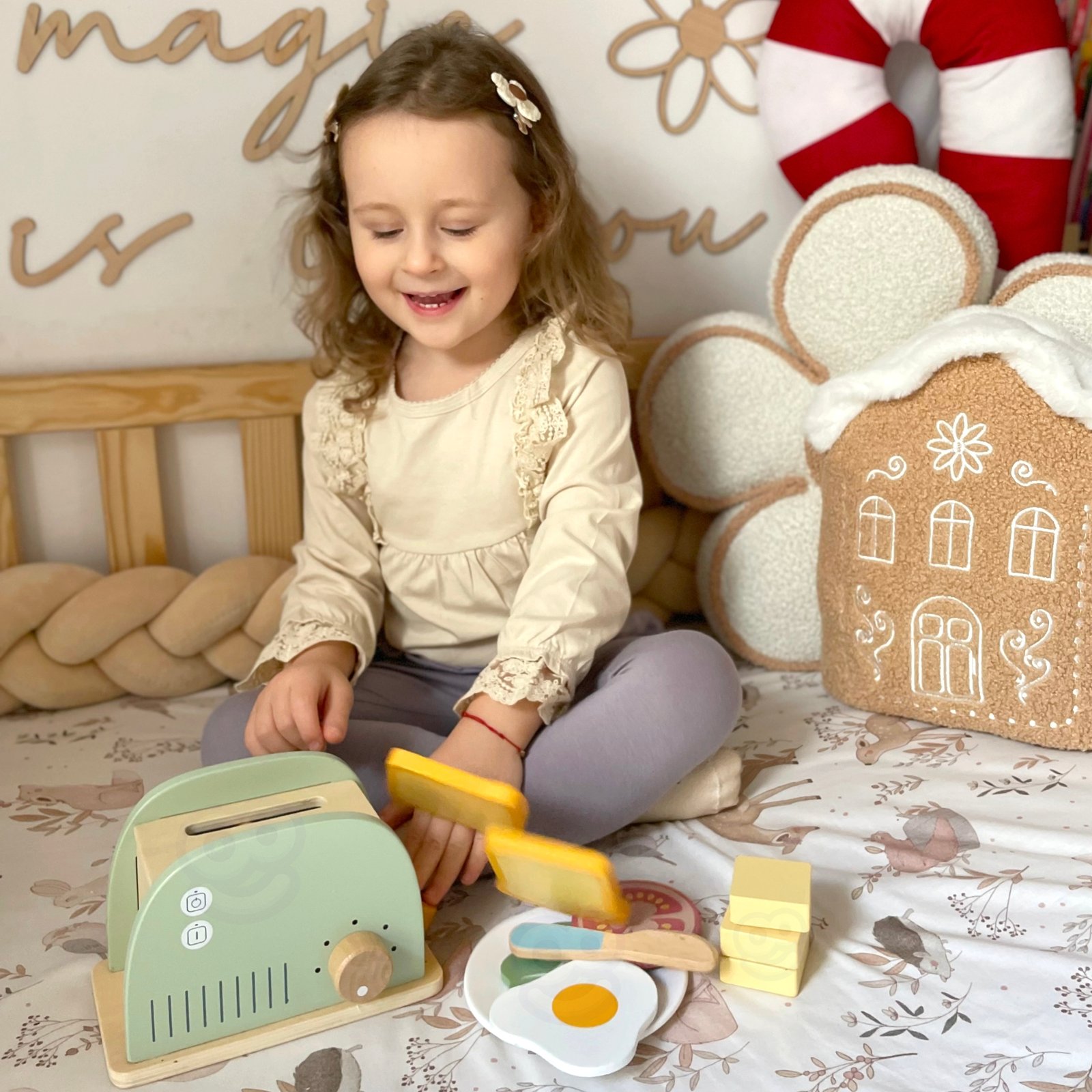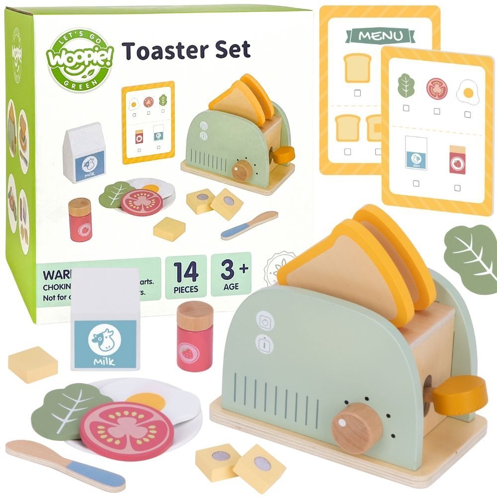 Medinis pusryčių rinkinys su skrudintuvu – puikus pasirinkimas vaikams, mėgstantiems žaisti „namus“, gaminti ir mėgdžioti suaugusiuosius. Šis rinkinys, įkvėptas kasdienių virtuvės veiklų, leidžia paruošti gardžius skrebučius, keptą kiaušinį ar sumuštinį su įvairiais priedais. Su juo vaikas galės tapti mažuoju virtuvės šefu, kūrybiškai ugdyti socialinius įgūdžius ir lavinti vaizduotę. Visas rinkinys pagamintas iš saugios, lygios medienos ir nudažytas netoksiškais, pasteliniais dažais. Šis žaislas ne tik gražus, bet ir tvirtas bei ilgaamžis. Rinkinys puikiai tinka tiek savarankiškiems žaidimams, tiek bendriems maisto ruošimo žaidimams su tėvais ar broliais ir seserimis. Tai puikus pasirinkimas, padedantis lavinti vaiko kasdienius įgūdžius per žaidimą.