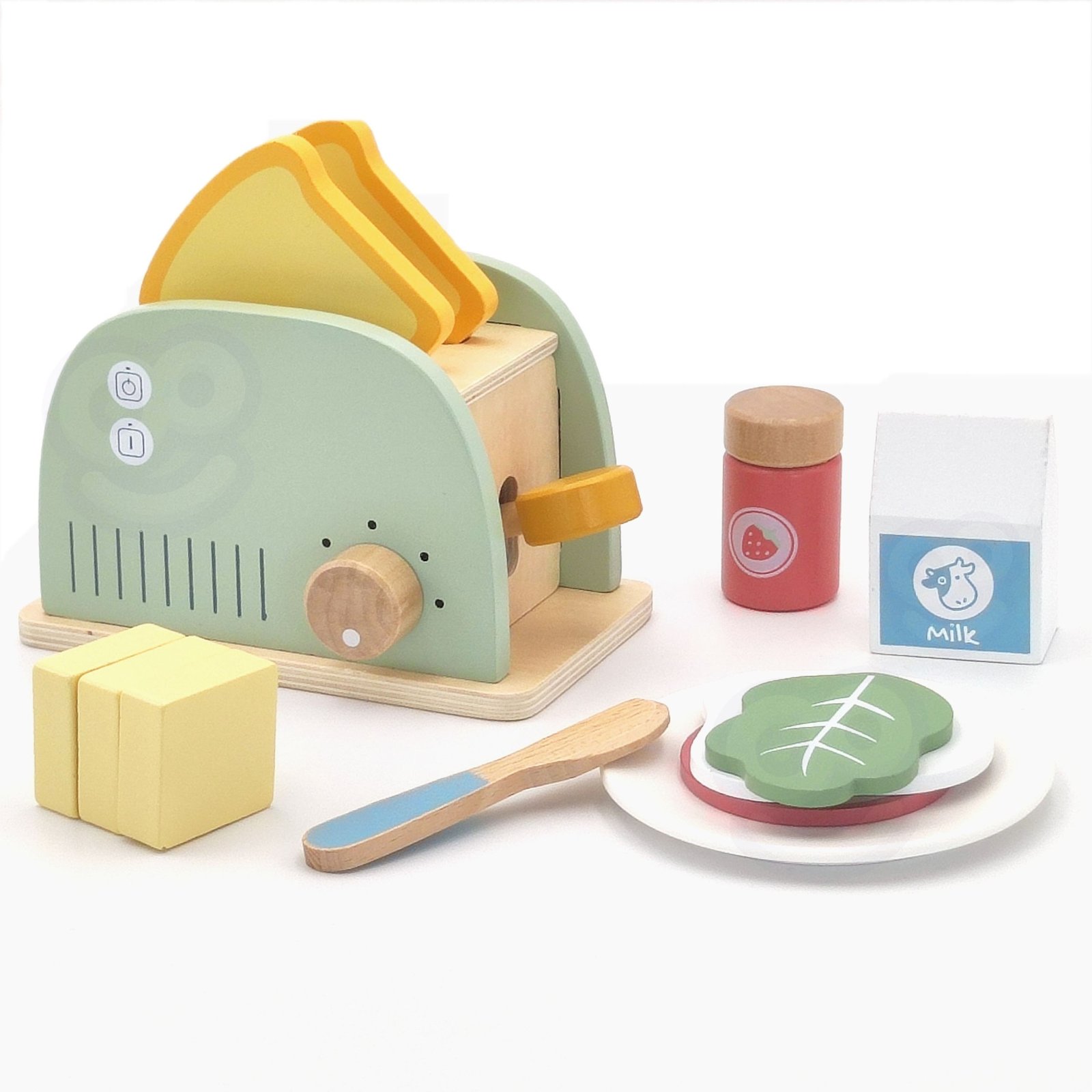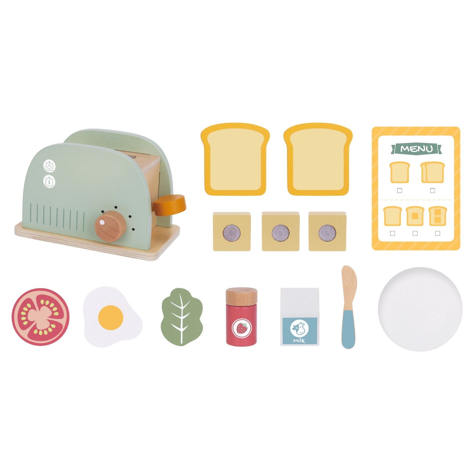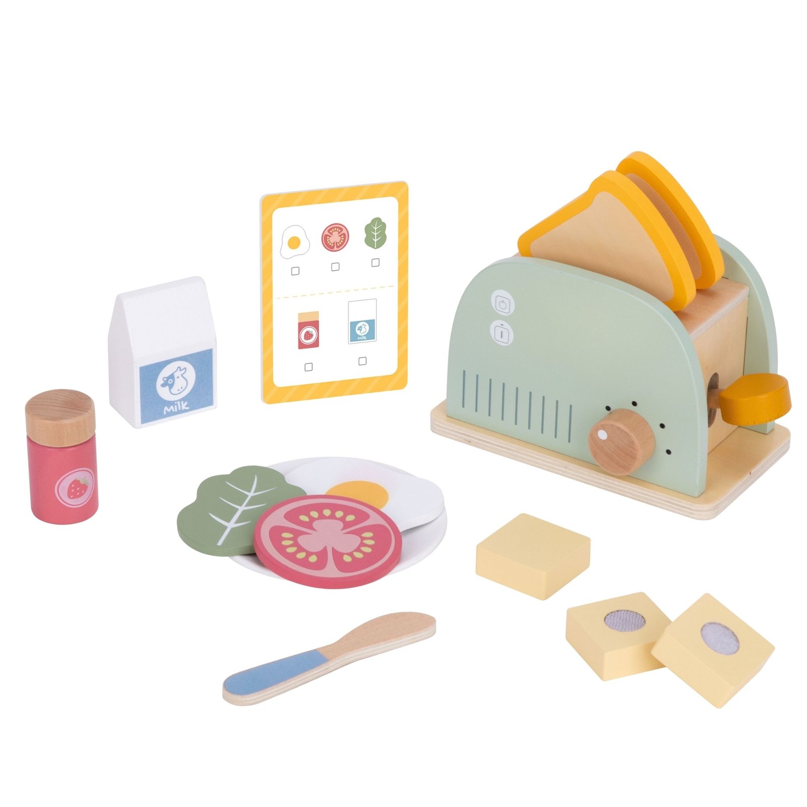 - Spalvingi priedai – rinkinyje rasite įvairių aksesuarų: duonos riekelių, sviesto, kiaušinio, pieno pakuotę ir salotos lapelį, leisiančius kurti įvairius pusryčių derinius.