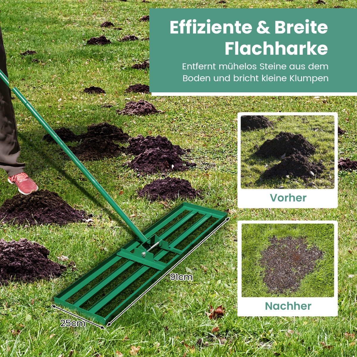 Profesionalus žemės niveliavimo grėblys – nepakeičiamas pagalbininkas tvarkant veją ir išlyginant paviršius. Jo platus 91×25 cm darbinis plotas leidžia greitai ir efektyviai pasiekti idealiai lygų ir prižiūrėtą vejos paviršių. Ergonomiškas dizainas ir ilga rankena užtikrina patogumą bei sumažina nugaros apkrovą dirbant.